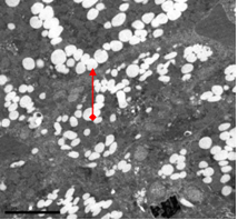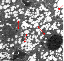 高血脂动物(左)喂服杏仁油软胶囊前后(右)肝细胞中脂肪滴的比较