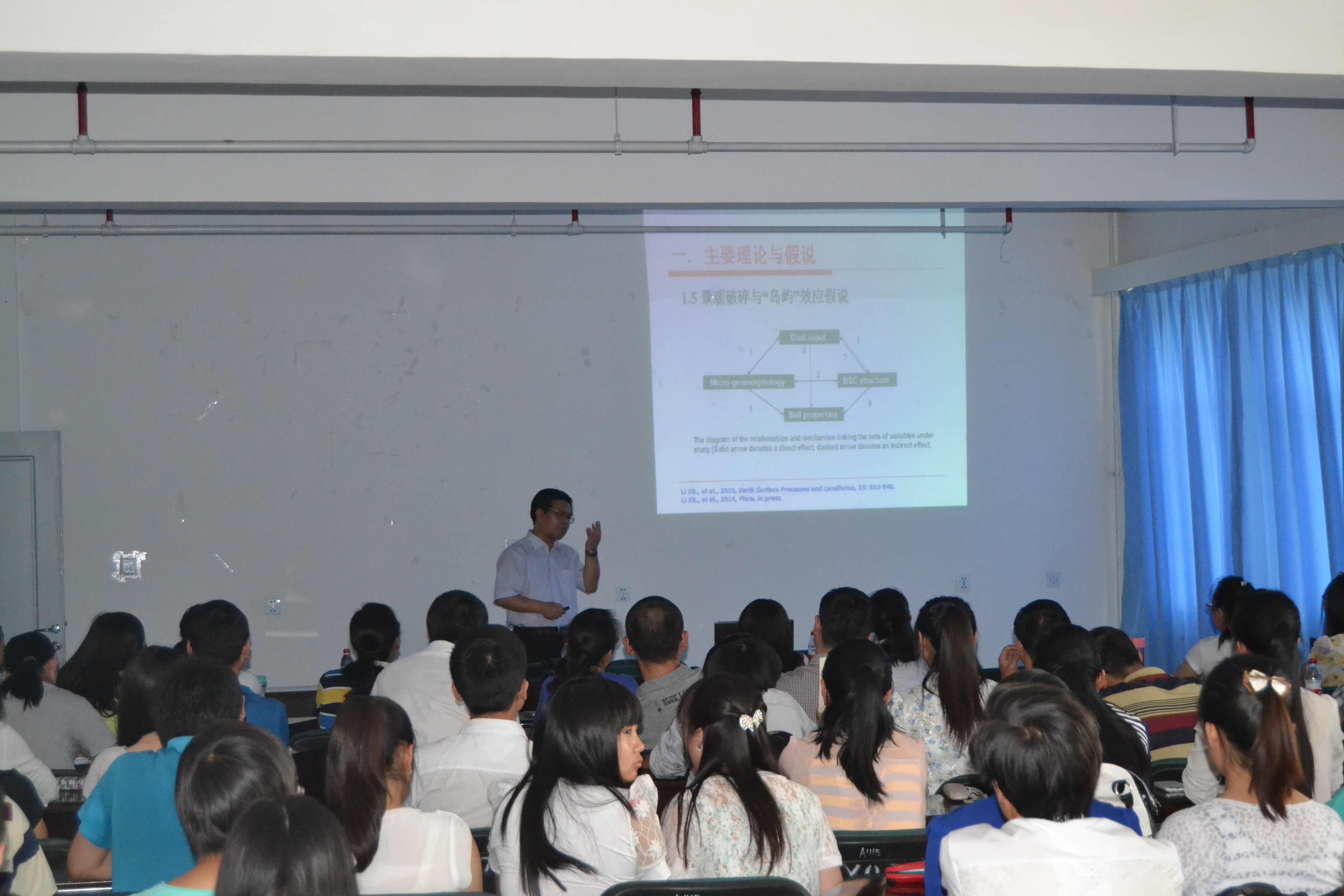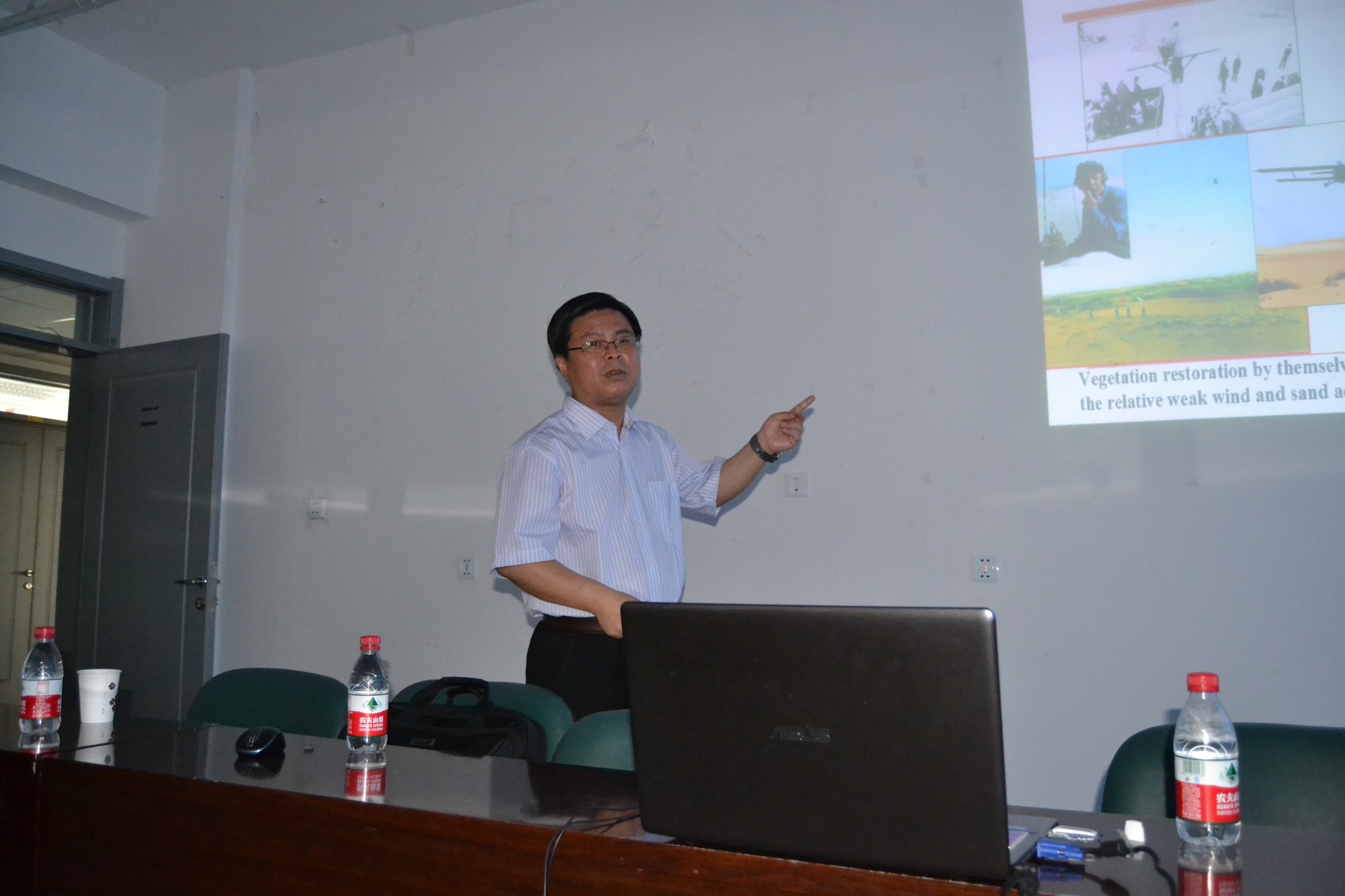 会上,李新荣研究员从干旱区生态恢复的主要理论与假说、荒漠生态系统恢复过程中的植被与理论、荒漠地区生态工程建设的环境效应、生态恢复的模拟预测等几个方面讲述了干旱区生态恢复的情况。通过此次讲座,大家了解到了干旱区沙害防治的紧迫性与重要性。精彩的讲座赢得了在场师生的热烈欢迎!