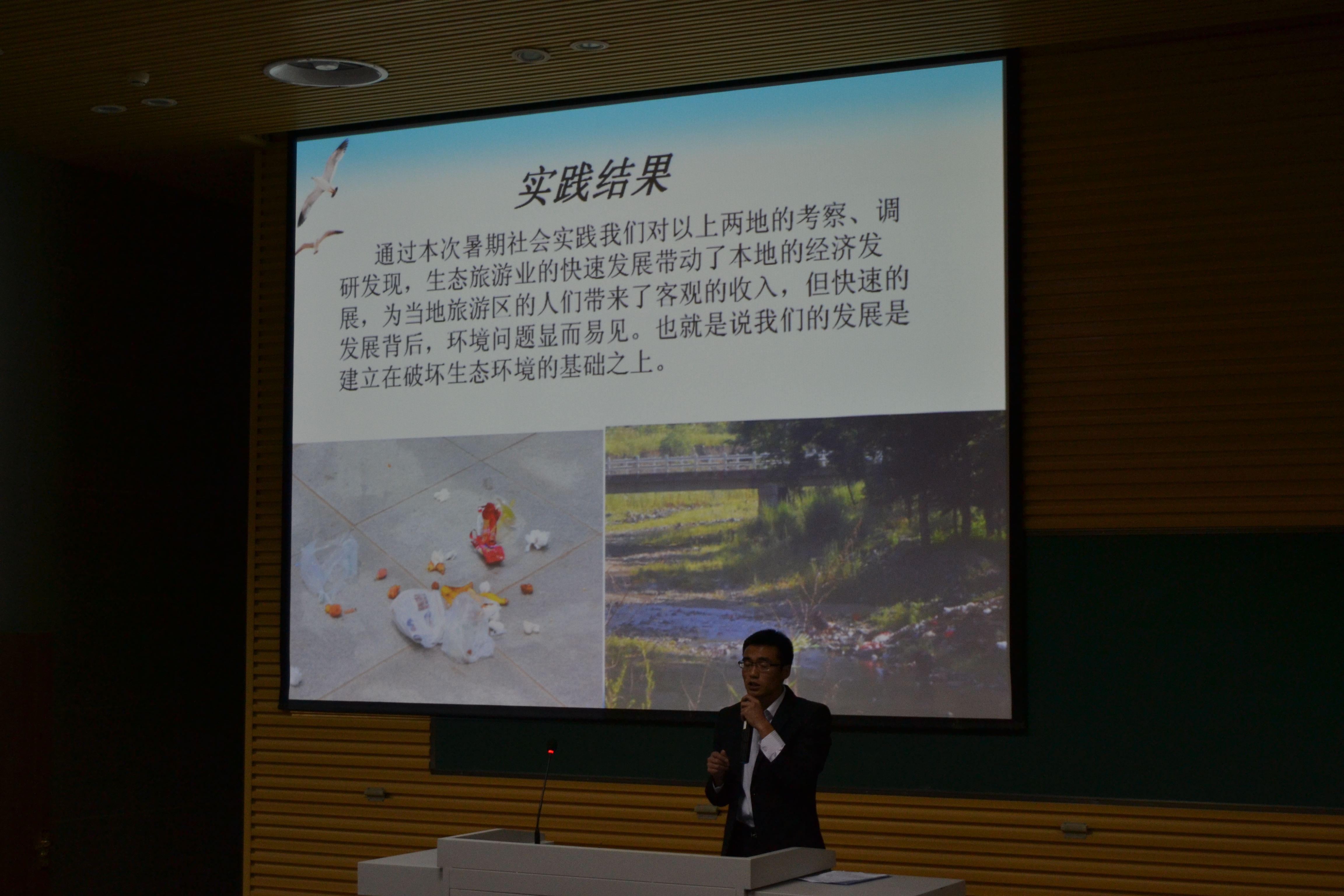 报告会开始后,8支实践小分队依次通过精美的PPT,对其社会实践成果进行陈述和展示:“拾遗战队”赴陇南市宕昌县开展中药材及真菌的采样分析,及当地居民生态保护意识的调研;“东光之行”小分队对定西、平凉、徽县等地的农村教育问题以及太统——崆峒山自然保护区的生态环境保护等实践课题进行调研;“一米阳光•新区之行”小分队走进兰州新区开展以“关爱女孩,行动起来”为主题的调研;“夏日茶韵”小分队赴陇南市文县了解茶叶种植的奥秘;“时代之光”小分队走进陇南市武都区的油橄榄企业及种植基地进行调研;“生科之星”小分队赴兰州市科研院所、企业开展生物专业本科生就业、考研情况的调研,取得了大量第一手的调研数据;“薯光之行”小分队赴定西马铃薯生产企业,对与我们生活息息相关的马铃薯育种及大棚种植情况进行调研;“爱心行”团队暑期公益献爱心活动走访了清水县7所公司、27个村庄,给当地的留守儿童、孤儿、空巢老人进行了相应的心理辅导,给他们送去了温暖。