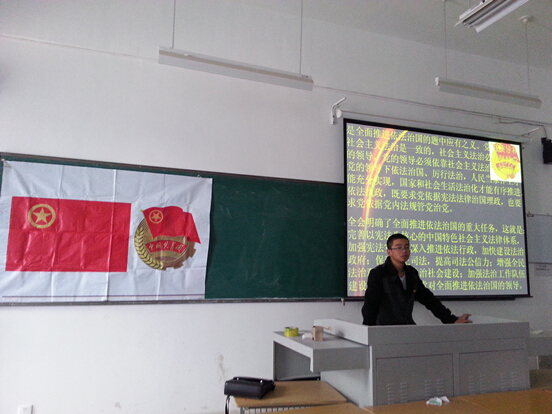 下午14点30分时活动正式开始,活动伊始,由团支部成员全体起立,合唱团歌。之后由团支部书记张东安通过PPT及相关视频向同学们详细介绍十八届四中全会的主要议程,重点阐述十八届四中全会精神,介绍会议有关“依法治国”主题的总体思路和改革方向。最后,由部分同学向大家阐释了自己对十八届四中全会精神的理解,并就有关方面的问题与全班同学进行了交流。