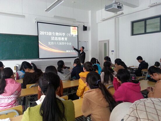 11月12日下午,金沙城js93线路检测中心2013级生物科学(1)班在新校区117举办以“十八届四中全会”为主题的团思想教育活动,本次活动在团支部领导班子和团支部成员的相互配合下成功举办。