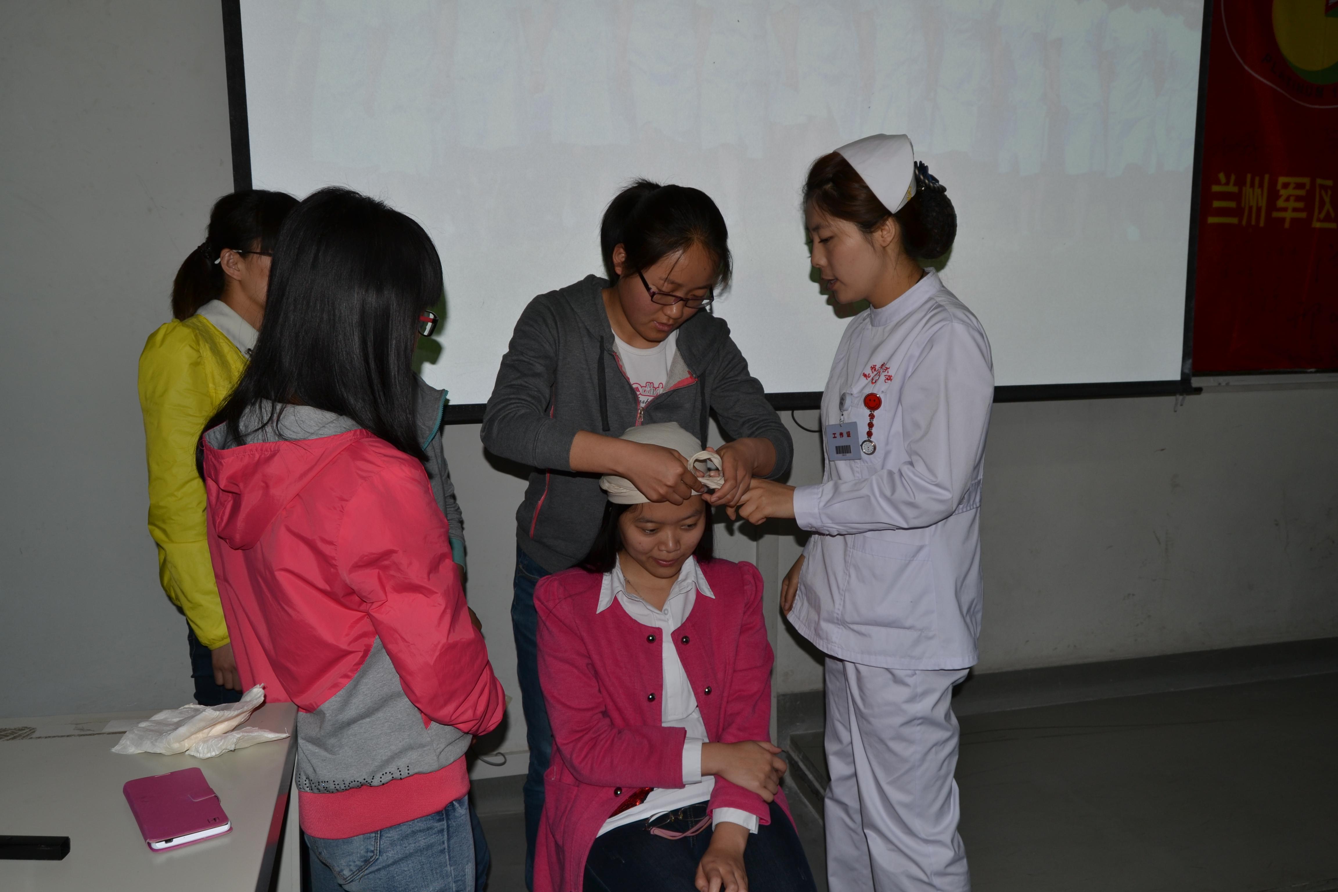 活动上,兰州军区总医院安宁分院急诊科护士长为同学们讲解了心肺复苏、人工呼吸、气道梗阻的急救、创伤急救、现场骨折固定、创伤搬运、现场逃生等七个方面的急救知识和急救时应注意的事项,并逐一做了现场演示,护士们也教了同学们一些急救包扎技巧,同学们也进行了现场试验。