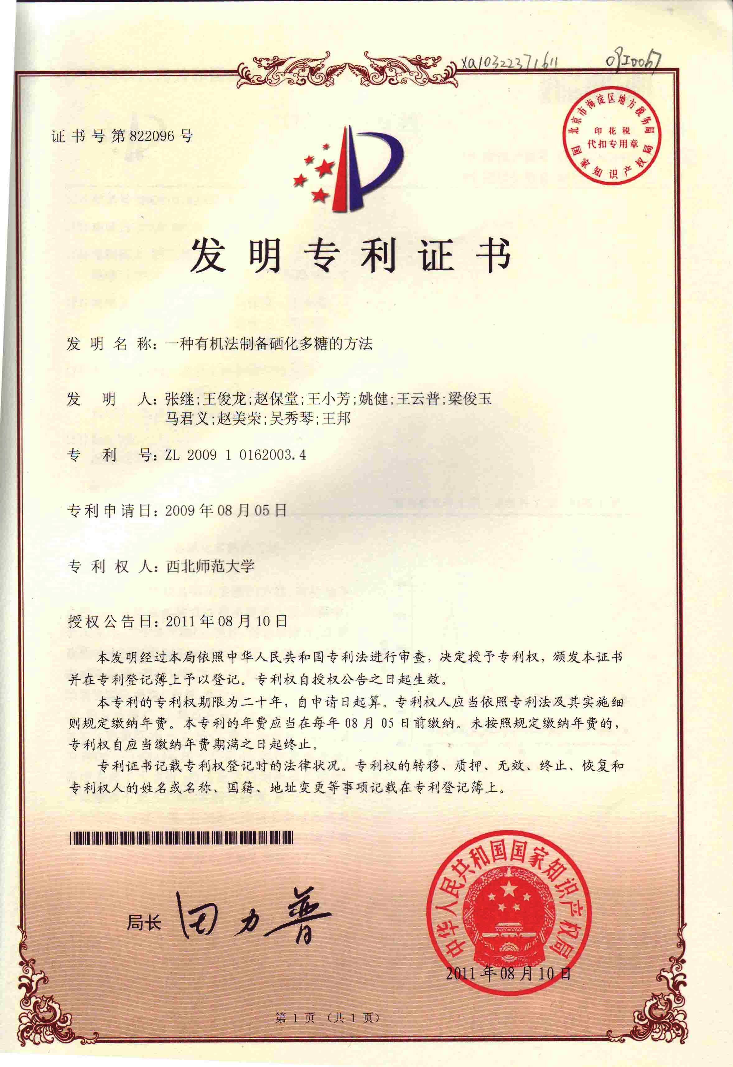 近日,省政府发布《2016年度甘肃省专利奖励的决定》(甘政发〔2017〕10号),对50项专利成果进行表彰奖励。由金沙城js93线路检测中心、甘肃特色植物有效成分制品工程技术研究中心(专利发明人:张继 王俊龙 赵保堂 王小芳 姚健 王云普 梁俊玉 马君义 赵美荣 吴秀琴 王邦)自主研发的专利技术“一种有机法制备硒化多糖的方法”(ZL 200910162003.4)获2016年甘肃省专利三等奖。