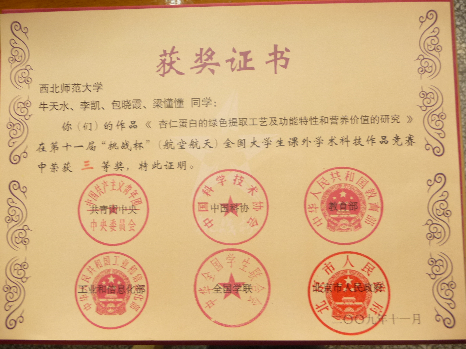 | 4 | 杏仁蛋白的绿色提取工艺及功能特性和营养价值的研究 | 牛天水 李凯等 | 张继 | 三等奖 | 2009年 | 第十一届 |