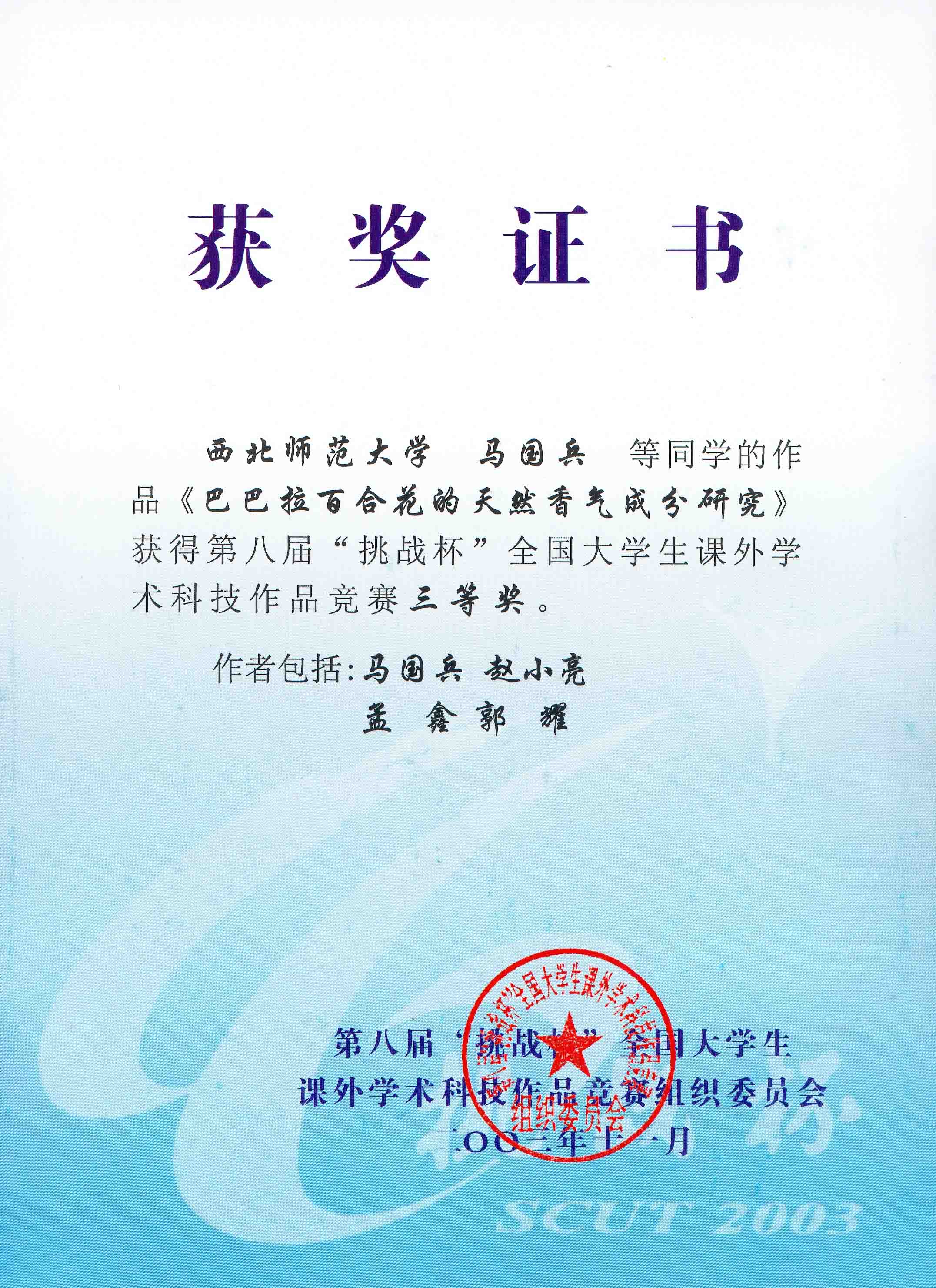 | 1 | 巴巴拉百合花的天然香气成分研究 | 马国兵 赵小亮等 | 张继 | 三等奖 | 2003年 | 第八届 |