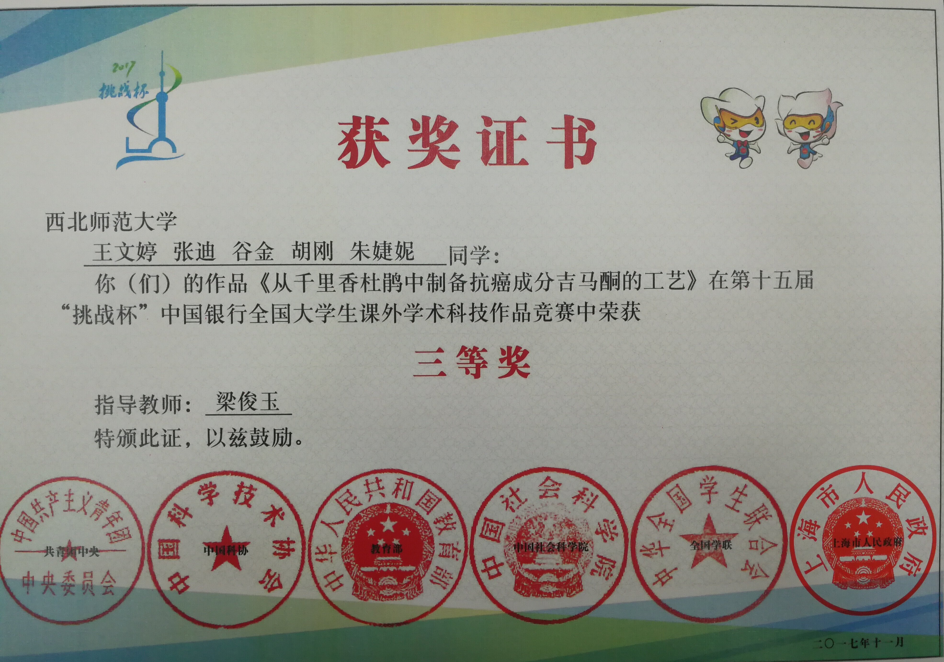 | 8 | 从千里香杜鹃中制备抗癌成分吉马酮的工艺 | 王文婷 张迪等 | 梁俊玉 | 三等奖 | 2017年 | 第十五届 |