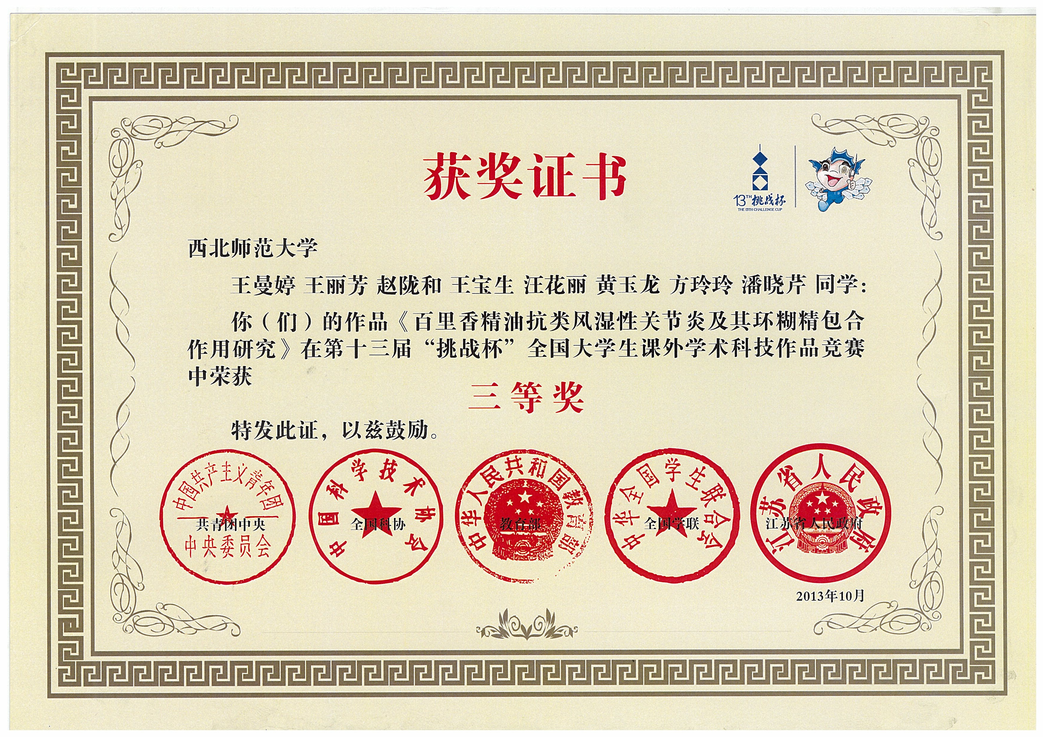 | 6 | 百里香精油抗类风湿关节炎及其环糊精包合作用研究 | 王宝生 汪花丽等 | 侯天德 马君义 | 三等奖 | 2013年 | 第十三届 |
