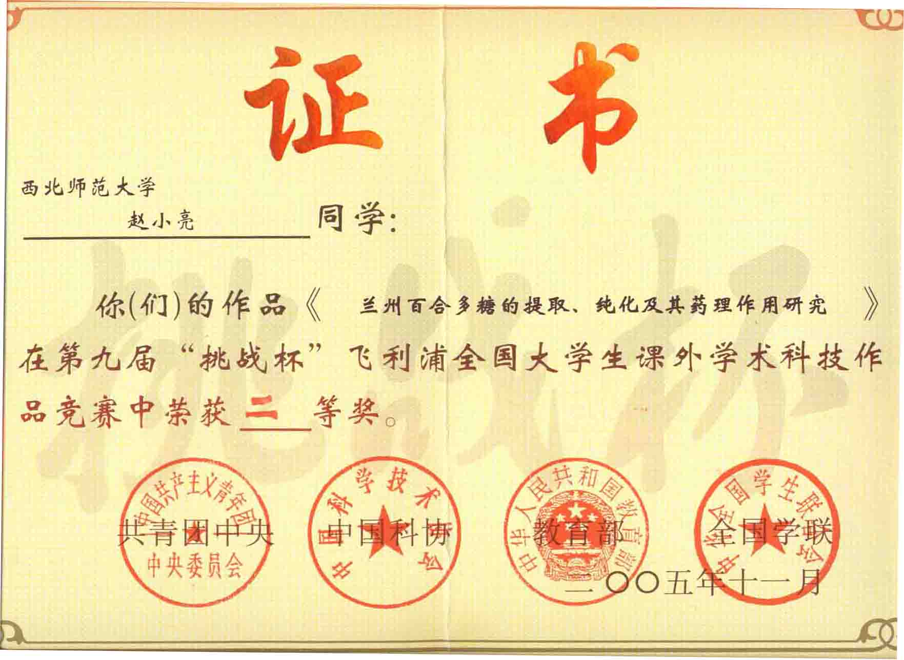 | 2 | 兰州百合多糖的提取、纯化及其药理研究 | 赵小亮 | 张继 | 二等奖 | 2005年 | 第九届 |