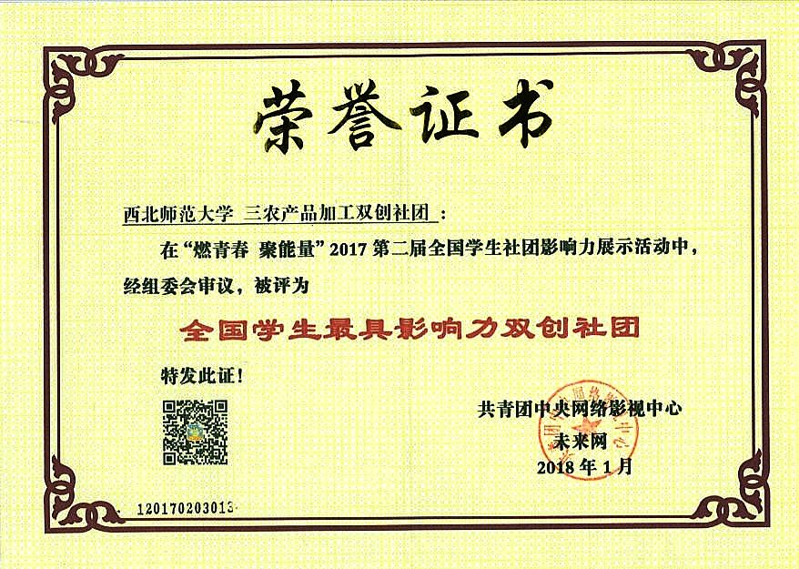 为积极宣传贯彻党的十九大精神,学习落实习近平总书记关于青年成长成才的一系列重要论述,发挥移动互联网、新媒体优势,近期,由共青团中央网络影视中心、未来网主办的“燃青春 聚能量”2017第二届全国员工社团影响力展示活动,得到了全国830所公司团委的大力支持,西北师大金沙城js93线路检测中心三农产品加工双创社团在全国8000多个踊跃参加的员工社团中脱颖而出,获得“全国员工最具影响力双创社团”的称号。