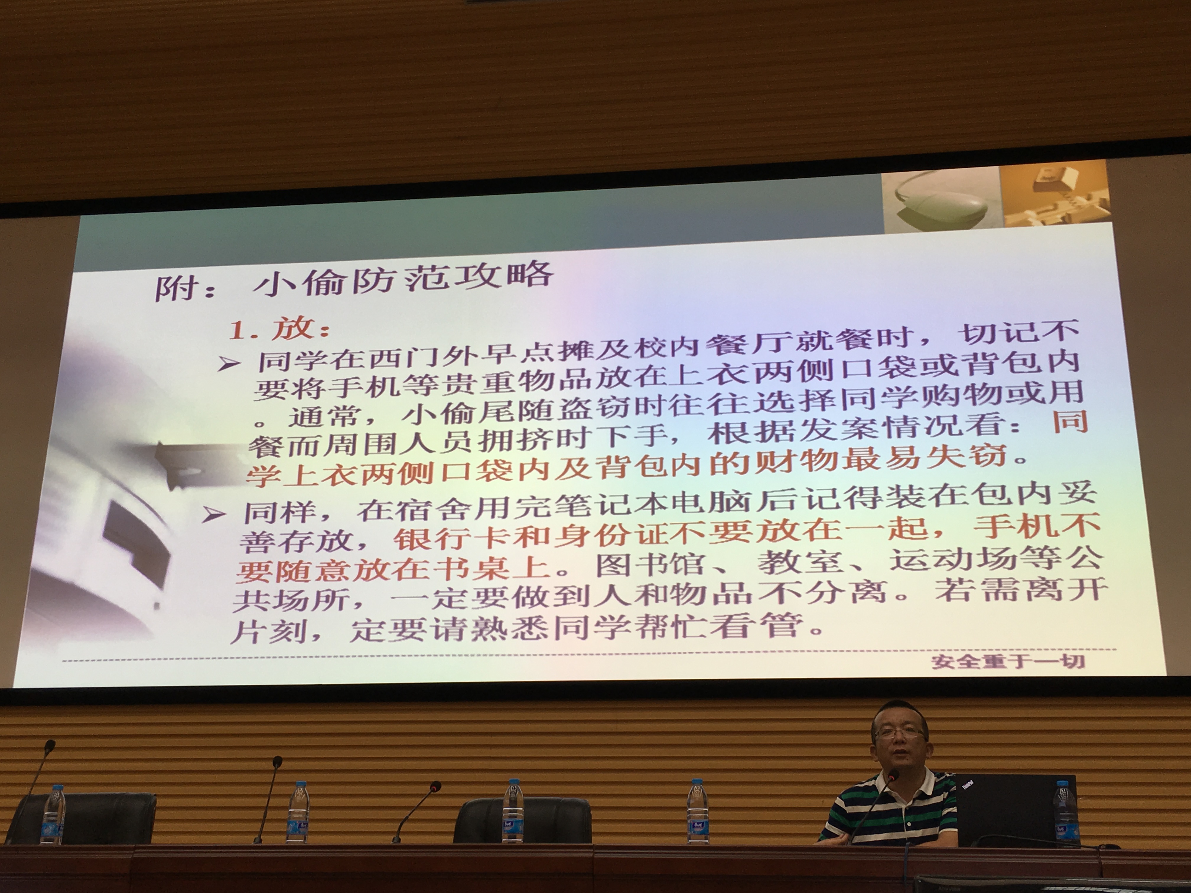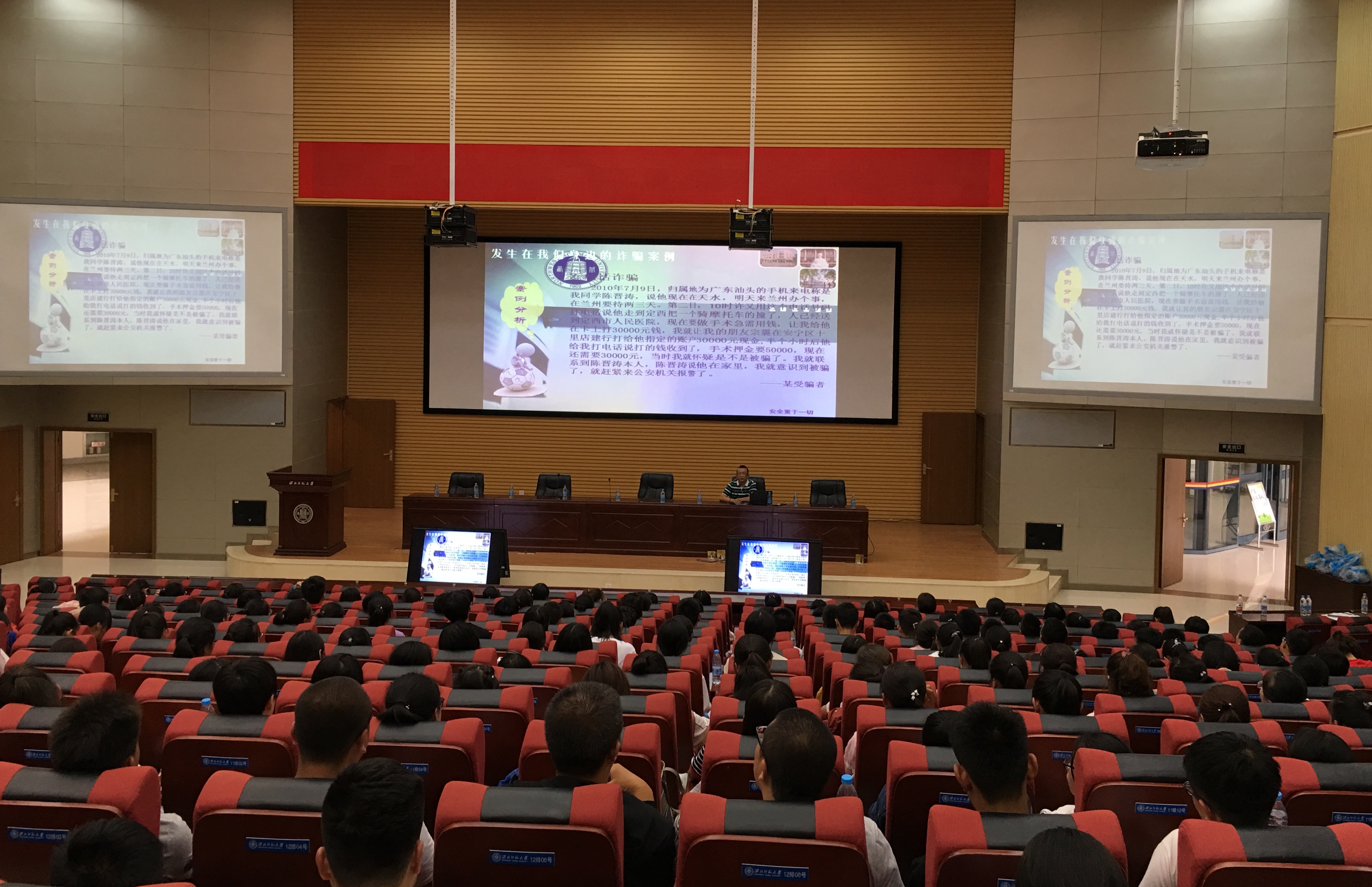 公司党委副书记石晓东老师作安全教育主题讲座,从安全使用手机到防盗、防骗、防火灾事故及校园贷等方面,用鲜活的案例给同学们以警醒,提醒同学们时刻注意自身的人身财产安全,平安度过四年的老员工活。
