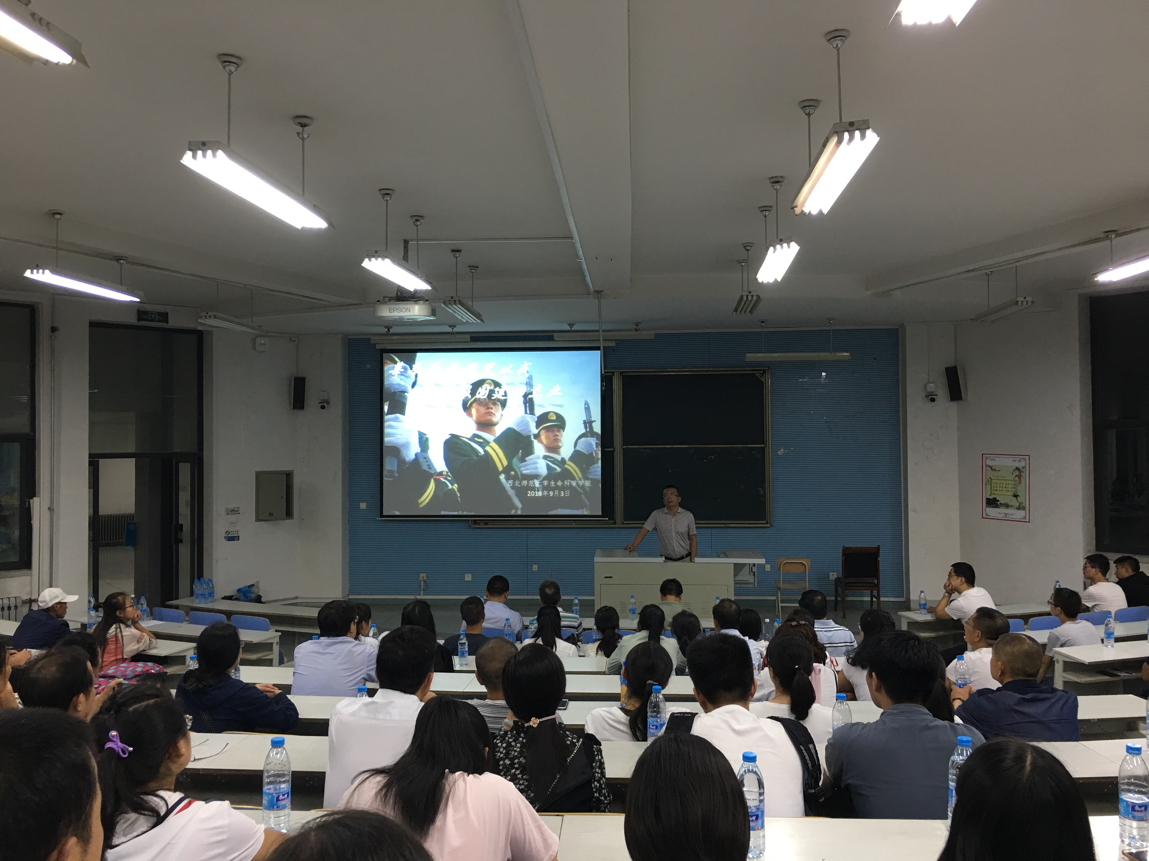 石晓东副书记简要介绍老员工应征入伍的政策和待遇情况,2015级生物科学1班王波辉同学作一名在大二时入伍,现已退役在校继续求学的退役军人代表,现身说法,介绍自己的入伍经历,鼓励老员工积极投身军营锤炼自己,报效祖国。
