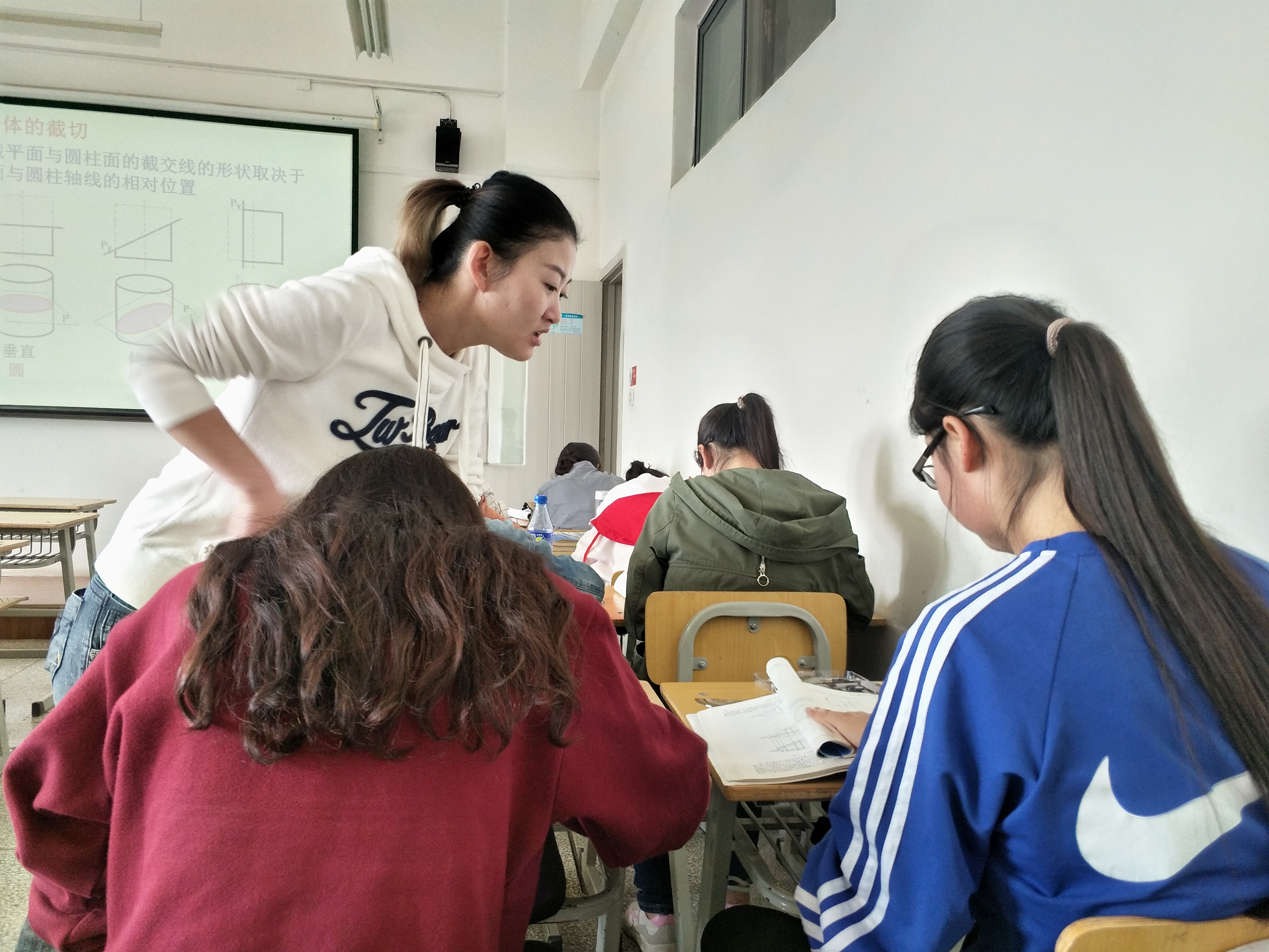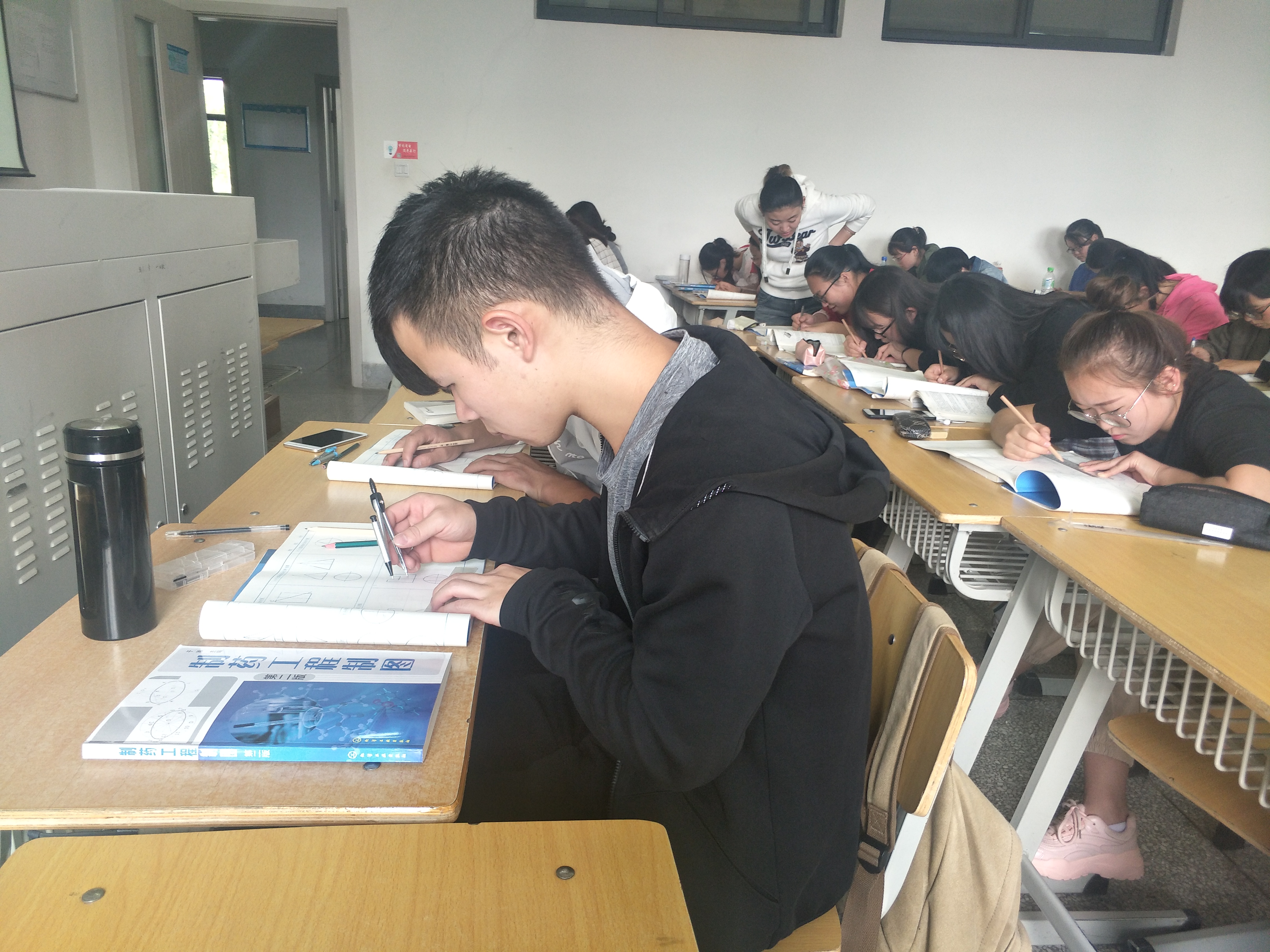在授课过程中,赵老师首先引导同学们回顾了上节课所学的“平面与回转体相交”内容,引出本节课的基本概念和基本作图方法;紧接着,通过一连串的例题讲解,带领同学们打开“圆柱体和圆锥体的截切”的新世界;最后是同学们的练习时间,同学们运用刚刚所学到的知识认真作图,而赵老师则在一旁观察指导。整堂课设计严整有序、结构紧凑,同学们认真听讲、仔细作图。