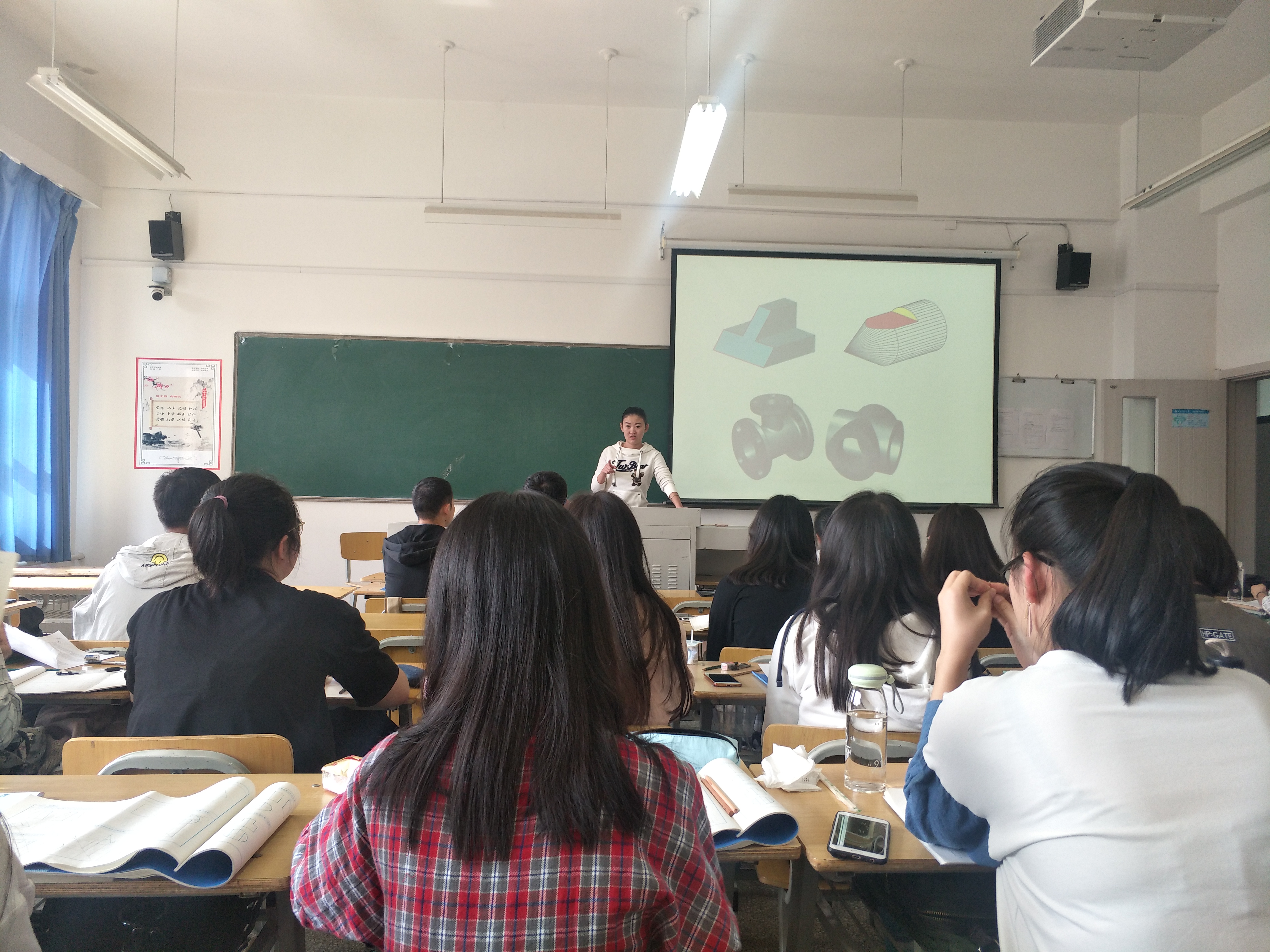 首场比赛的参赛者是青年教师赵潇,她在新校区教学楼114教室主讲了工程制图一课中的“截切立体的三面投影图”。