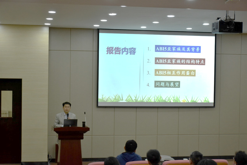 报告会上,马老师介绍了ABI 5亚家族在植物中的研究,主要内容包括ABI5的结构特点,功能,以及与其相互作用的蛋白AFPs。ABI5及其亚家族成员是一类碱性亮氨酸拉链类转录因子,参与了脱落酸(ABA)介导的植物体对许多生物及非生物胁迫的应答,利用酵母双杂交系统进一步分离出与其相互作用的AFPs蛋白,并通过过表达和敲除等技术对ABI5和AFPs的功能进行了深入分析。报告结束后,马老师和与会师生进行了相关问题的激烈探讨。报告会取得了圆满成功。