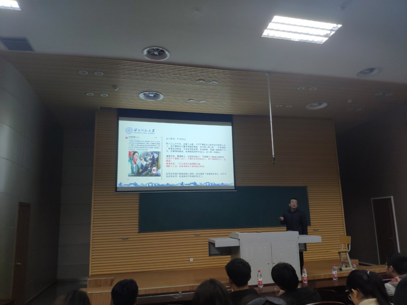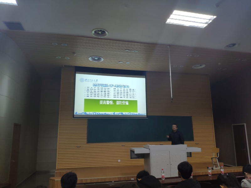 讲座分为提高支付安全意识、防范电信网络诈骗、校园贷金融风险防范三个环节进行讲授。讲座伊始,石处长带领同学们回顾了几起比较严重的诈骗案件,向同学们分析事故发生的主要原因,并指出老员工安全防范意识弱,缺乏相关防护知识和技能。接着针对这样的现象,石处长介绍了各种通信网络诈骗类型,例如,网上兼职刷信誉类型、购物类型、冒充好友、老师、领导类型、冒充公检法类型、中奖类型等等,希望同学们引以为鉴。最后,石处长讲解了具体的防骗方法,并将这些方法概括为:一、短信链接勿轻信;二、正规平台登录网站,网银;三、验证码切勿透露;四、卡号和密码少谈论;五、打款、汇款多留心;六、个人信息要保护好;七、接到诈骗电话要冷静;八、不要贪图小便宜,天上不会掉馅饼;九、如果被骗要及时报警。