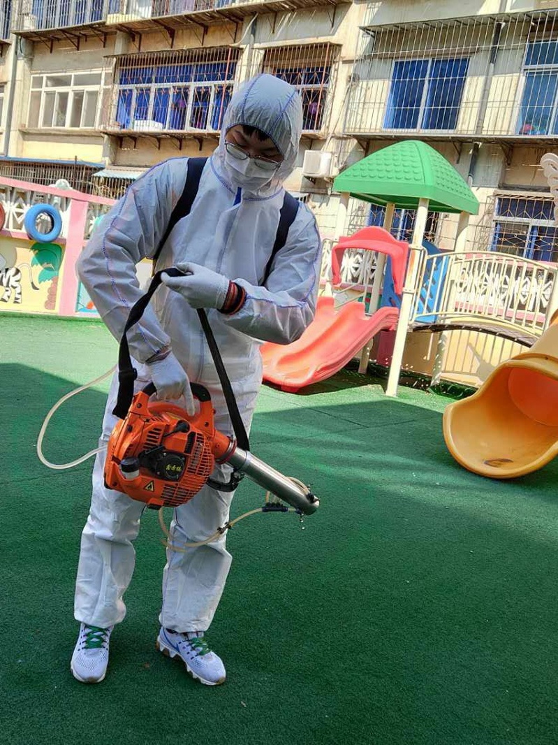 2018级生物科学2班的迟骋跟随着大连市蓝海救援队,一同加入了疫情防控当中,“我拿的是枪冲式的大型消毒机,在两个居民小区和两个幼儿园进行地毯式的消毒。为了疫情防控,尽到自己的责任,这是我应该做的。”