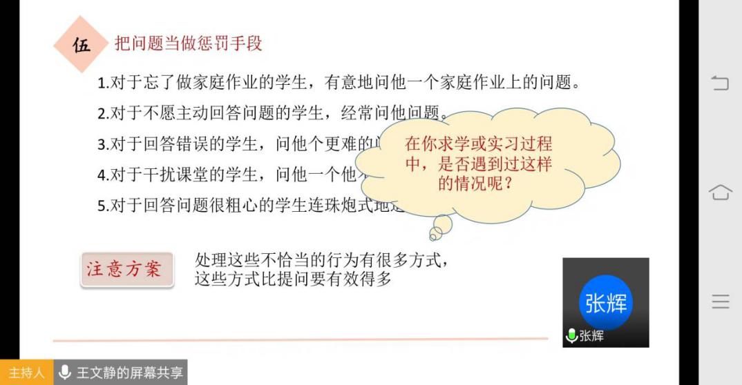 首先,针对第一个问题,同学们都分享了自己的相关经验,如鱼金艳同学和马梅同学提出,自己在实习时,因为没有将问题表述清楚,而使用了过度复杂的语言组织问题,导致员工不能理解问题并做出回答。对于第二点,我们提出问题:如果你是老师,员工回答的问题和你预设的答案不同,你会怎么办?我们提出可以使用探询的手段,逐渐帮助员工导向答案的目标。第三点,牵扯到了封闭性问题和开放性问题,同学们展开了积极讨论,并且举了一些例子,对于王婧婧同学提出的比较异同到底属于哪一类问题,同学们还比较有争议。第四点,我们提出教师如何正确的自问自答,马蕊同学提出,当教师在课前进行导入时,可进行自问自答环节。第五点,同学们认为,把提问可以作为督促和警示员工的方法,但不可过分故意使员工难堪,这样会挫伤员工学习的积极性。