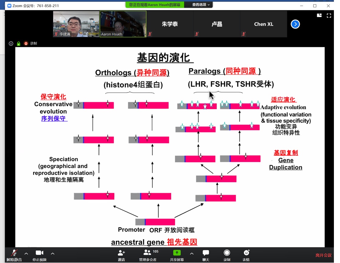 报告会上,薛教授主要从自身研究经历出发,介绍演化的化石证据,自然选择及性选择;物种起源演化论的遗传基础,与人为选择在演化中起的作用;人类基因如何演变以适应高海拔、寒冷气候、高乳糖的生活环境;并讨论人类演化与急性传染病,包括天花病毒传播、黑死病与艾滋病毒抵抗力;演化与慢性疾病,比如现代人趋向肥胖,糖尿病风险高,现代女性癌增加。报告中薛教授还介绍了近期新型冠状病毒的最新研究进展,并通过演化角度进行了分析和解读。报告最后,薛教授和与会师生就报告中的相关问题进行了在线互动交流。