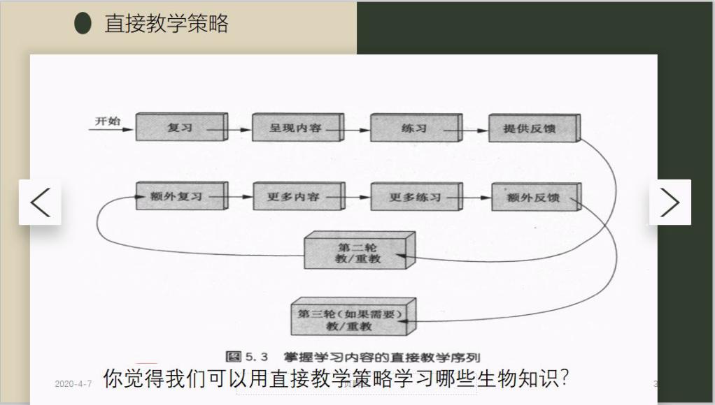 活动最开始,主持人介绍了本次活动主题,并向同学介绍了直接教学策略的相关概念和掌握学习内容的直接教学序列。由于生物学科的特殊性和知识的相对抽象,结合其事实类的知识序列较多的特点,因此,直接教学策略在生物学科的实操性强,涉及的内容多,就需要未来的准教师对这一内容也更深层次的理解和思考,这也是本次讨论的意义所在。