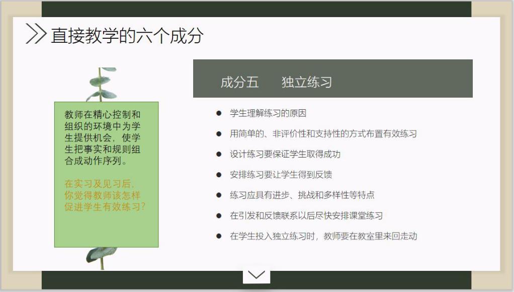 本次会议主要讨论了直接教学策略里的四个重要成分,分别是日常的复习及检查、呈现和组织新内容、指导员工练习及教师怎样做到让员工有效的练习。