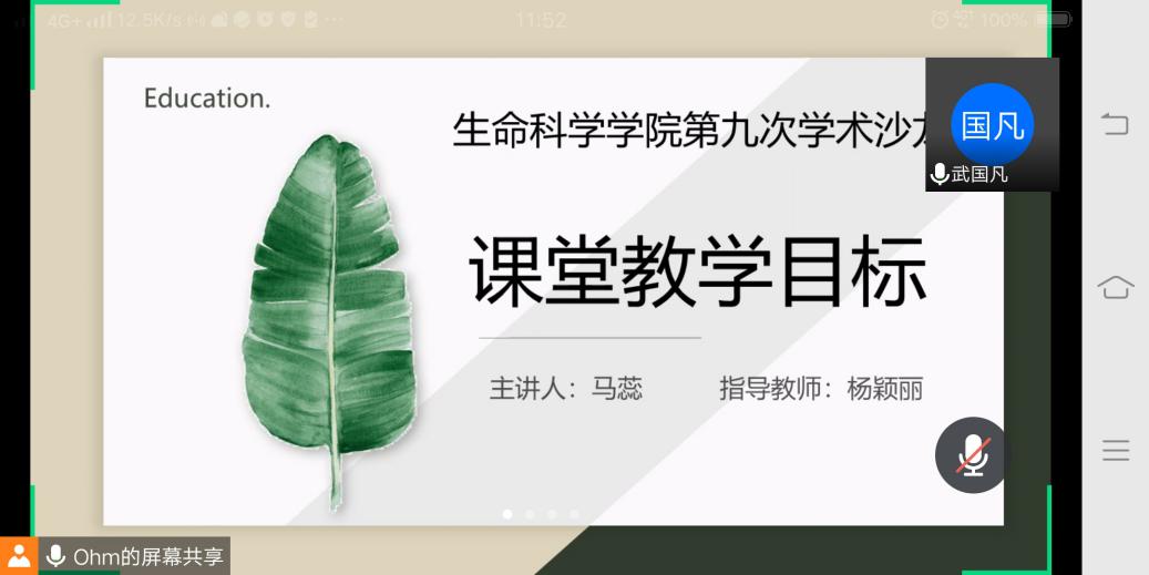 2020年5月9日上午,公司首届本硕一体生(学科教学-生物)借助腾讯会议平台举行了本学期第九次学术沙龙。本次沙龙由马蕊同学主持,邀请了张辉老师和武国凡老师参会指导,参会者包括公司七名本硕一体生。本次沙龙讨论的主要话题是“课堂教学目标”。