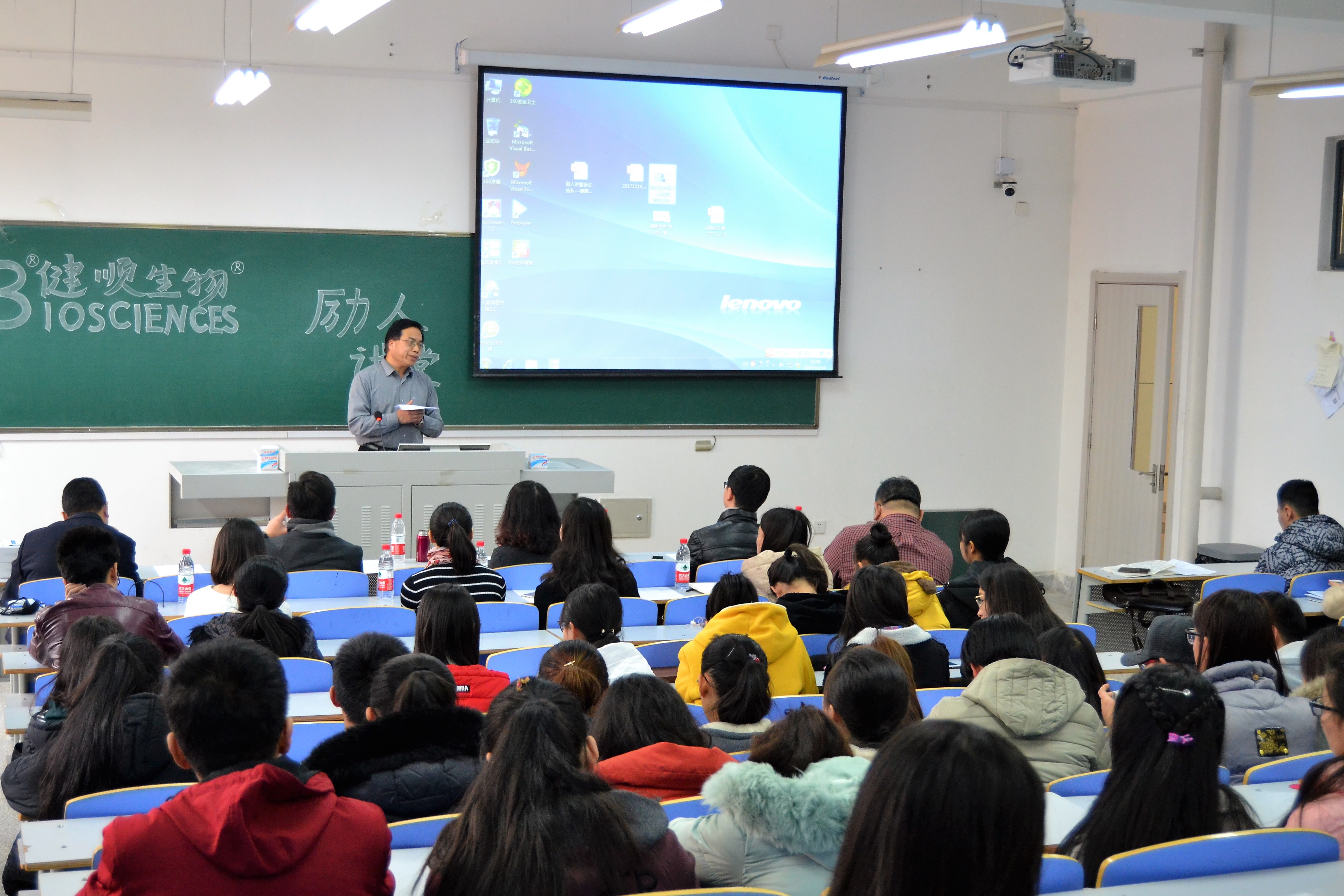 2017年12月14日下午,金沙城js93线路检测中心“励人讲堂”系列活动第四期在新校区101教室举行,甘肃健顺生物科技有限公司研发团队围绕“生物制药如何与我们息息相关?”这一主题为2015级、2016级、2017级制药工程班和2017级生物科学班同学作了一场精彩的报告。报告会由制药工程系主任马君义教授主持。