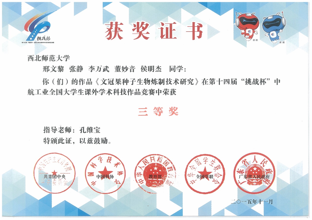 7 | 文冠果种子生物炼制技术研究 | 邢文黎 张静等 | 孔维宝 | 三等奖 | 2015年 | 第十四届 |