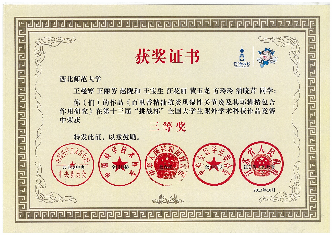 6 | 百里香精油抗类风湿关节炎及其环糊精包合作用研究 | 王宝生 汪花丽等 | 马君义 侯天德 | 三等奖 | 2013年 | 第十三届 |