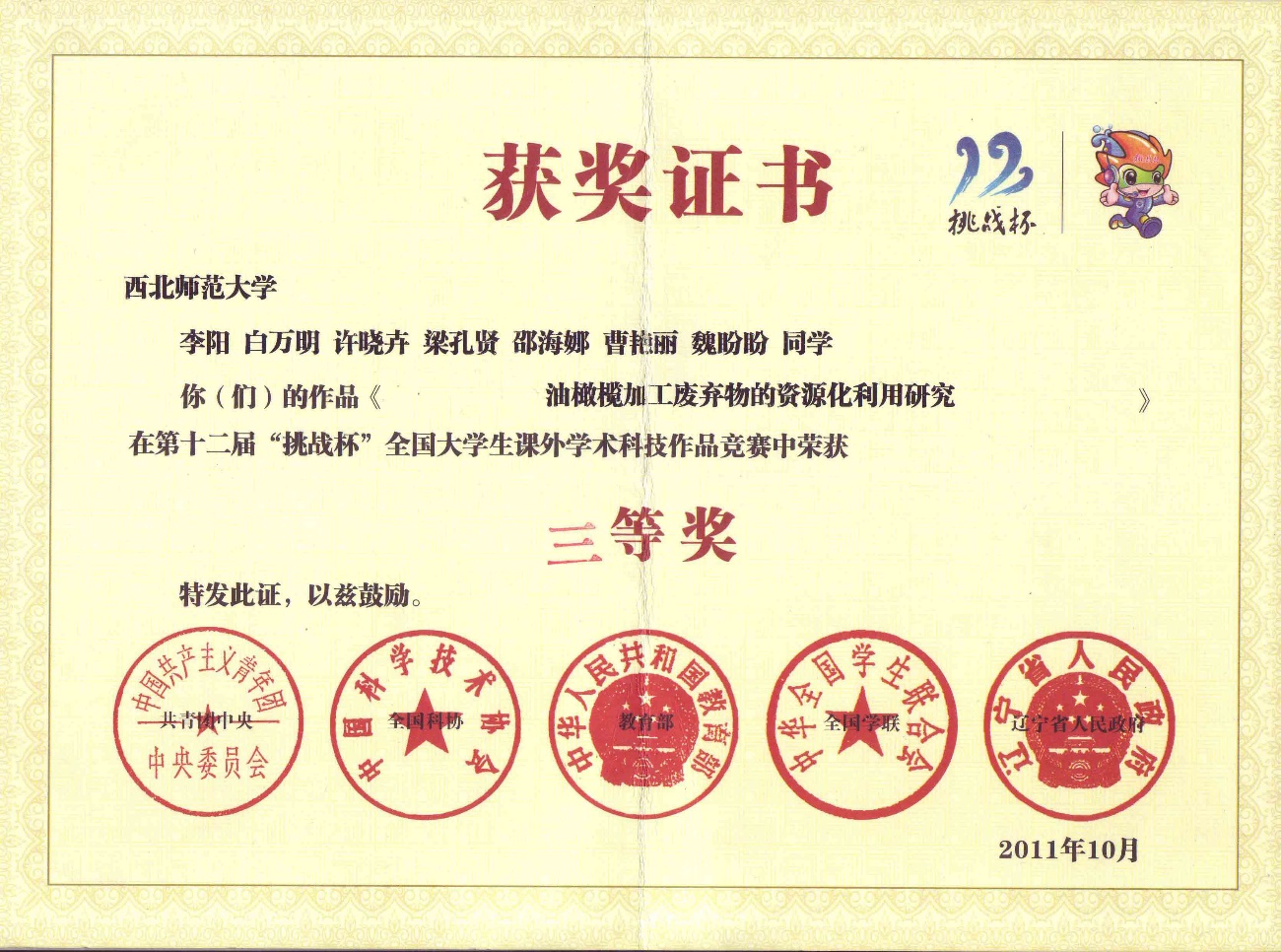 5 | 油橄榄加工废弃物的资源化利用研究 | 李阳 白万明等 | 张继 孔维宝 | 三等奖 | 2011年 | 第十二届 |