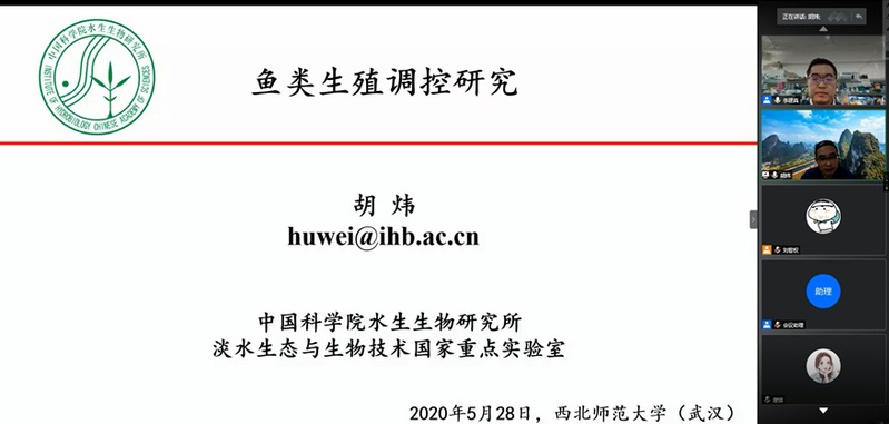 报告会上,胡炜研究员从调控配子发生发育的下丘脑-脑垂体-性腺轴(HPG轴)为切入点,介绍了GnRH/kiss神经元的起源、迁移与定位,kiss2调控雌性而非雄性垂体激素的作用,GABAergic神经元在生殖中的功能,GnRH3在斑马鱼性别分化中的功能,scg2在生殖和性行为中的功能以及鱼类配子成熟需要RNA的m6A甲基化修饰等六个方面。报告最后胡炜研究员和与会师生就报告中的相关问题进行了在线互动交流。