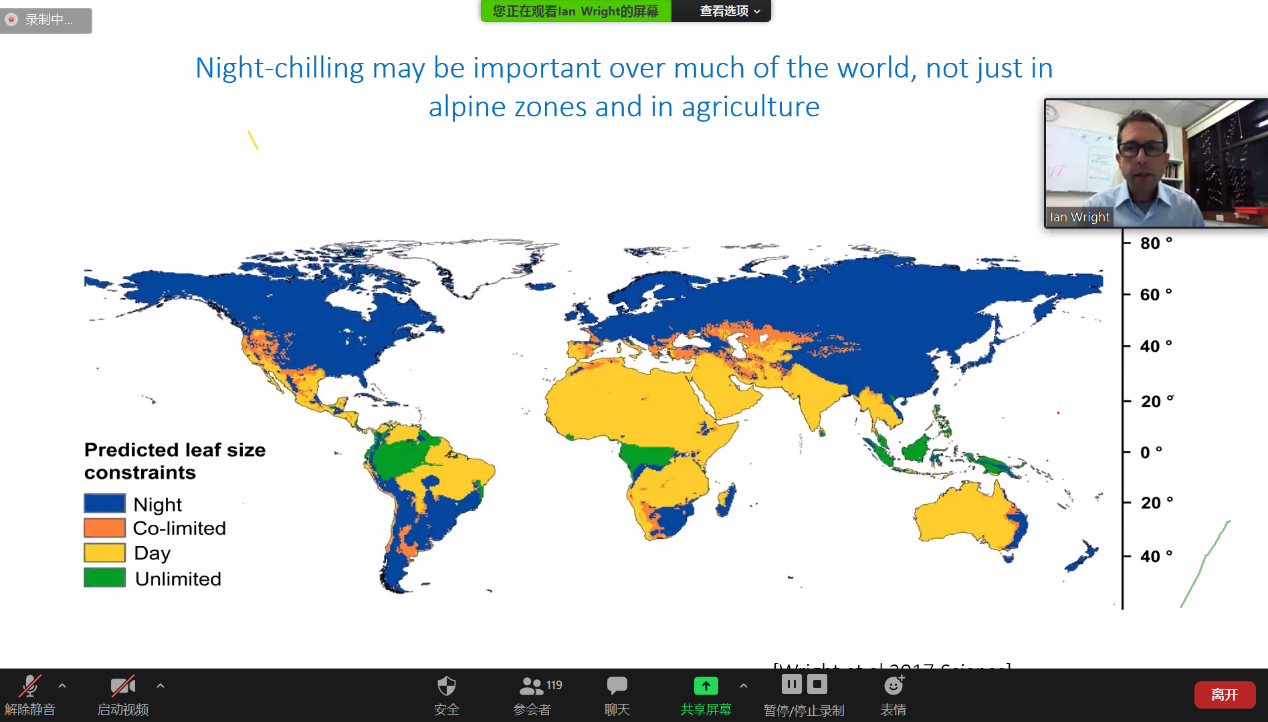 6月18日下午,公司诚邀澳大利亚麦考瑞大学教授,澳大利亚科公司院士Wright Ian教授,通过在线Zoom网络平台作了题为“Plant form and function along environmental gradients”的学术报告。此次报告由李建真教授主持,共有120余位师生在线收听了报告,包括清华大学、南京大学、中国科公司生态中心、兰州大学、四川大学、新疆生态与地理研究所、宁夏大学和公司等在内的多所高校和研究所的师生。报告中,Wright教授对植物功能性状的发展历史做了简单介绍,之后从他实验室的研究成果入手,对植物(尤其是叶子)的形态和功能随环境梯度发生变化的原因进行了深入的分析,并从植物生理学和解剖学的研究角度探讨了气候和土壤因素对植物功能性状的作用机制。Wright教授报告内容专业且丰富,吸引了多名国内其他高校老师的兴趣和提问,参会者与Wright教授进行了积极的讨论和交流。