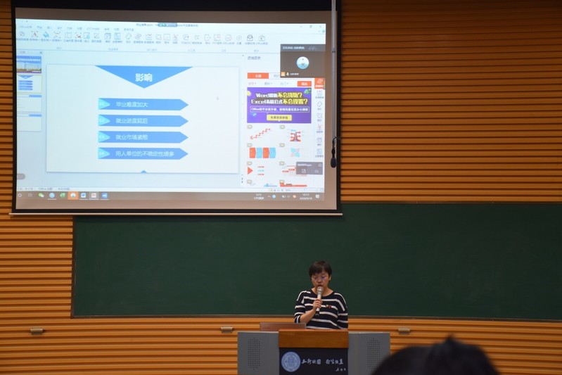 在大会一开始,李婷婷副书记分析了后疫情时代下的就业新常态,介绍了就业的新模式、新途径,旨在帮助同学们认清形势,做好自己的职业规划。李书记鼓励同学们打破惯性思维,在危机中看到机遇,并善于抓住机遇。毕业不代表待业或失业。