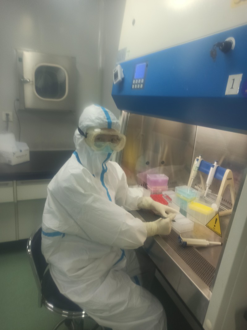 目前,国内新冠疫情已经得到有效控制,但境外输入患者及无症状患者时有发生。2020年9月、10月、12月,云南瑞丽、山东青岛、辽宁大连等地出现新冠疫情病例,疫情防控警报再次拉响。在广州凯普生物科技有限公司的综合调度下,米全凤、武等等、潘玉娟、韩慧贤、毛赋玮、李菊梅、马雪、苏增智等8位同学于9月14日前往云南昆明支援新冠病毒的检测,其中4人整理采集的样本,并对样本进行梳理编号和复核,4人将处理好的样本进行DNA提取、加样和检测。之后,米全凤、潘玉娟、韩慧贤、毛赋玮4位同学又于10月16日前往山东济南支援新冠病毒的检测。在新冠病毒的检测过程中,同学们全力以赴,一丝不苟,兢业认真,精力高度集中,一旦发现疑似阳性样本,定会反复核查直到结果确认。在每天紧张忙碌的工作中,尽管防护服里的衣服被汗水浸透、耳朵被口罩勒破、鼻子被护目镜压红……,但没有一个人说累,没有一个人退缩,每个人眼里都是坚定,经过日夜奋战,实习同学与公司其他同事一同交出了筛查十多份样本的满意答卷。