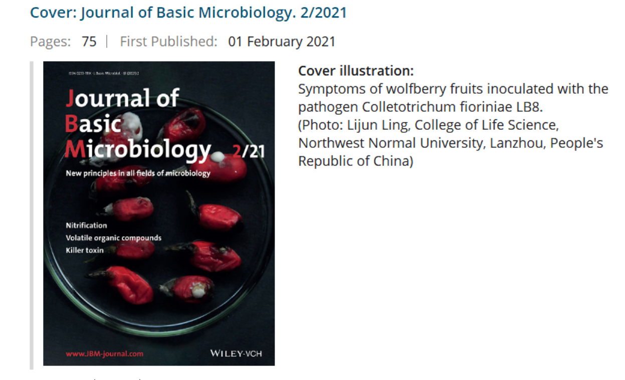 公司令利军课题组在对植物内生菌生防资源的研究中发现,来自华重楼的内生Bacillus subtilis CL2可产生挥发性有机物(VOCs),其具有广谱性杀菌特性,在对枸杞采后病害的防治中发现,VOCs可有效防控枸杞采后病害,延长枸杞保鲜期。同时,课题组首次采用HS-GC-IMS技术对微生物来源VOCs进行成分解析,阐明了主效成分,并探究了生防机制。本研究具有潜在的理论价值和广阔的应用前景,研究论文The inhibitory effect of volatile organic compounds produced by Bacillus subtilis CL2 on pathogenic fungi of wolfberry近日发表于《Journal of Basic Microbiology》,得到了主编的好评并推送至封面。