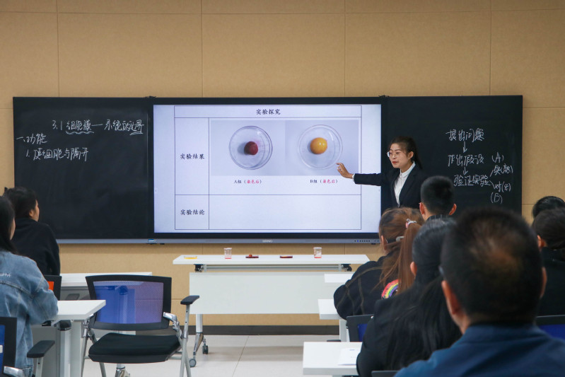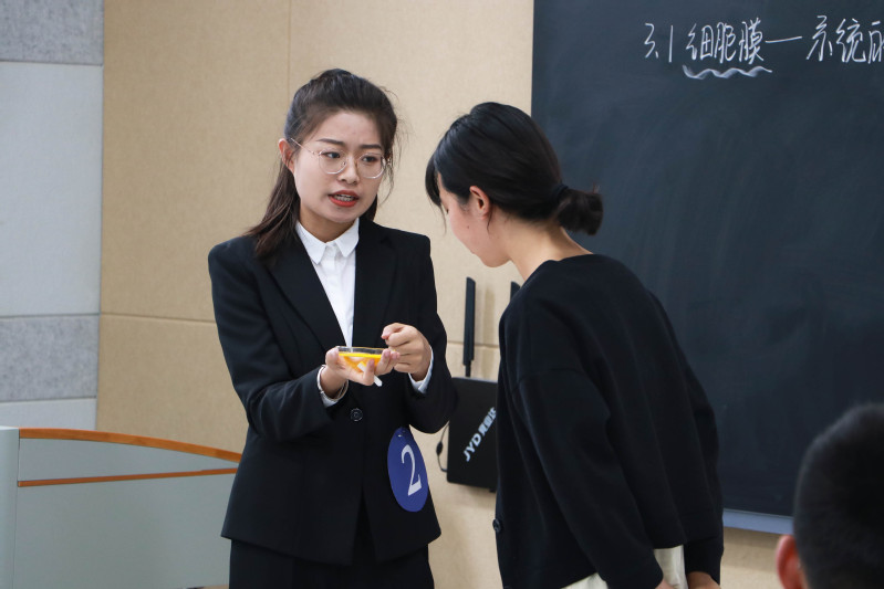 在决赛中,史文静同学采用以多媒体为主,板书为辅的授课方式,本着“员工为主体、教师为主导”的教学理念,对细胞膜的三大功能进行讲解,通俗易懂的动画效果、生动活泼的授课方式,与同学们的热情互动,大大提高了在场同学课堂参与度。
