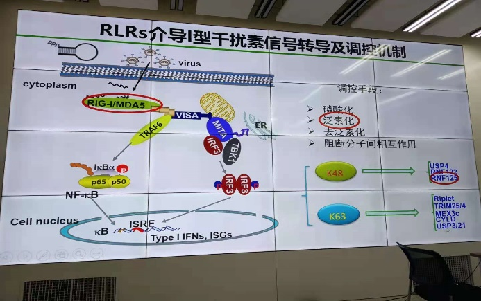 报告中,李丹副研究员详细介绍了口蹄疫病毒侵染机制的研究背景和进展;并阐述了口蹄疫病毒抑制G3BP1介导的RIG-I信号通路的信号调控机制和应用前景。报告进行了2个小时,报告会后李丹副研究员与公司师生就相关问题进行了互动交流。 茹毅助理研究员详细介绍了疫苗的研究历史和进展;并阐述了口蹄疫亚单位疫苗创制的策略,并向参会的师生介绍了中国农业科公司兰州兽医研究所在口蹄疫亚单位疫苗创制的进展。报告进行了2个小时,报告会后茹毅助理研究员与公司师生就相关问题进行了互动交流。