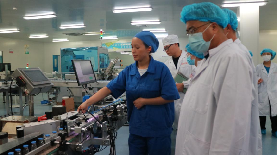 图为倍特药业头孢粉针车间工作人员讲述生产线操作过程
