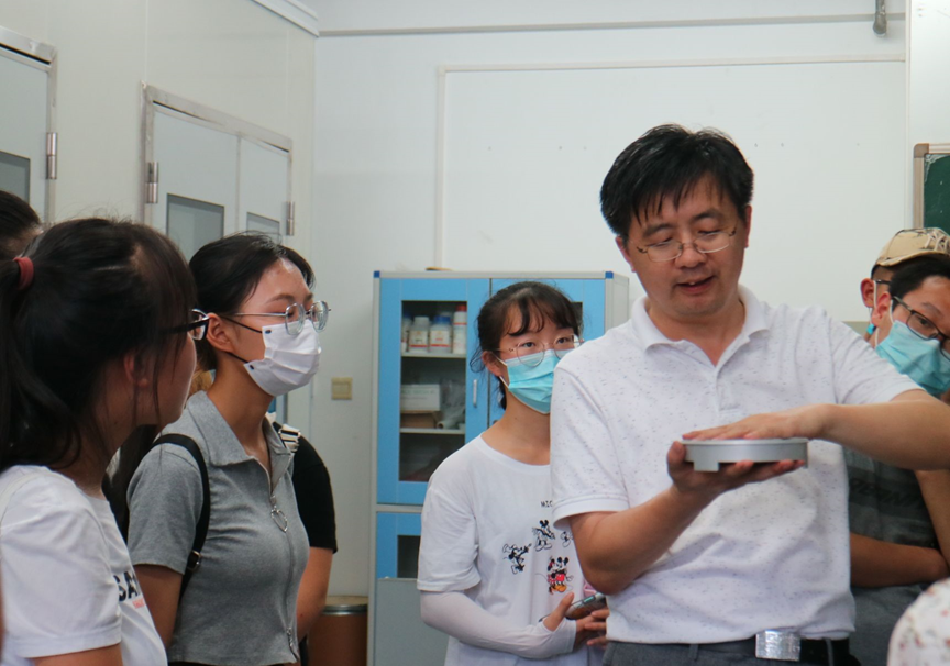 7月27日下午,实践团队来到四川大学江安校区,承强老师带领团队参观了第一实验楼A座与第一教学楼C座,讲述与观摩并行,引导与启发相随。在承老师幽默风趣的解说下,从试剂储藏室开始逐个参观,分别参观了生化分析室,药剂实验室,天然产物提取室,药物化学实验室,HPLC分析室,化学制药工艺室,洁净操作室及发酵工艺室,并具体介绍了各个实验室内的重要仪器设备,诸如压片机,包衣机,脆碎度检查仪器,粉体流动仪,分子蒸馏设备等,并做了粉体流动仪的操作演示,实践团队成员仔细聆听并认真记录,从阐述的理念、深刻的见解、精密的仪器中感受到了制药工程专业领域的魅力,打开了另一扇制药的大门。