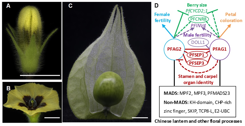 该研究成果已于2021年8月23日在线发表在国际主流学术期刊Plant Molecular Biology上,题目为“Multiple and integrated functions of floral C-class MADS-box genes in flower and fruit development of Physalis floridana”。公司赵婧副教授和中国科公司植物研究所公丕昌副研究员为论文的共同第一作者,中国科公司植物研究所贺超英研究员为论文的通讯作者。该研究得到了国家自然科学基金项目、中国科公司战略性先导研究项目和中国科公司青年创新促进会等项目的资助。