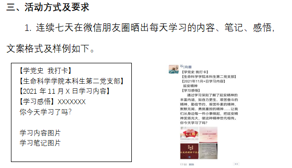 2021年11月10—17日,金沙城js93线路检测中心本科生第二党支部为进一步推动党史学习教育,调动支部全体同志学习积极性,营造良好学习氛围,结合支部党史学习教育方案,开展线上“七天打卡学习达人活动”。