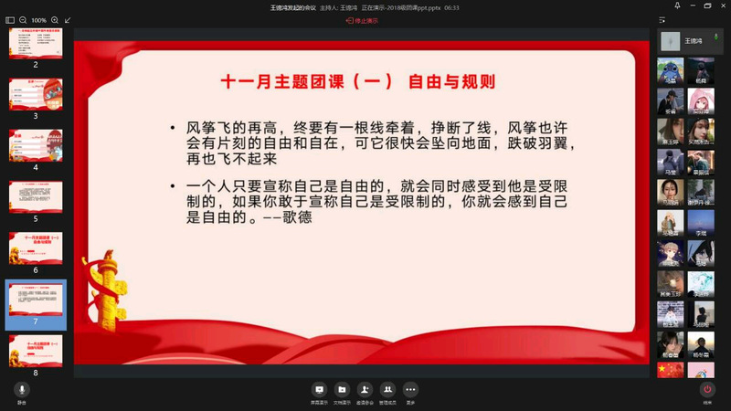 公司团支部分别以“自由与规则”、“尊重与包容”、“责任与担当”、“科学与理性”、“感恩与奉献”、“生命与生活”、“逆行与成长”七个系列主题展开本次团日活动。团课第一项:防疫知识的科普。团支书通过视频播放、PPT文字叙述等方式,从新冠疫情的感染症状、传播方式、预防手段等各个方面,展开防疫知识的科普。团课第二项:向抗疫英雄致敬,学习抗疫精神和先进事迹。团课第三项:讨论发言环节。在团课结束之际,团员对共抗疫情发表了自己的感想,团员们纷纷表示真切的感受到了全国人民团结抗疫的力量。