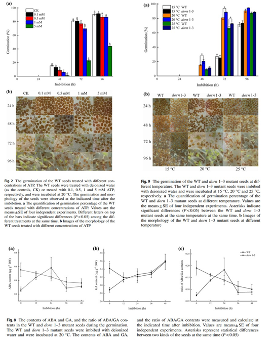 因此,课题组验证了细胞外ATP可能作为一种信号分子调控拟南芥种子萌发的假设。测定了种子萌发过程中细胞外ATP水平的动态变化,并研究了外源ATP、DORN1突变对种子萌发的影响。此外,考虑到ABA/GA和环境温度是影响种子萌发的关键因素,课题组还测试了细胞外ATP是否会影响种子萌发过程中ABA/GA含量的比值,以及细胞外ATP对种子萌发的调控是否依赖于外部温度。该研究以“Extracellular ATP is involved in regulating Arabidopsis seed germination”为题,近期在线发表于《Planta》(IF2020=4.116)。本研究有助于理解细胞外ATP在植物中的作用,并拓展目前关于细胞外ATP调控种子萌发的知识。