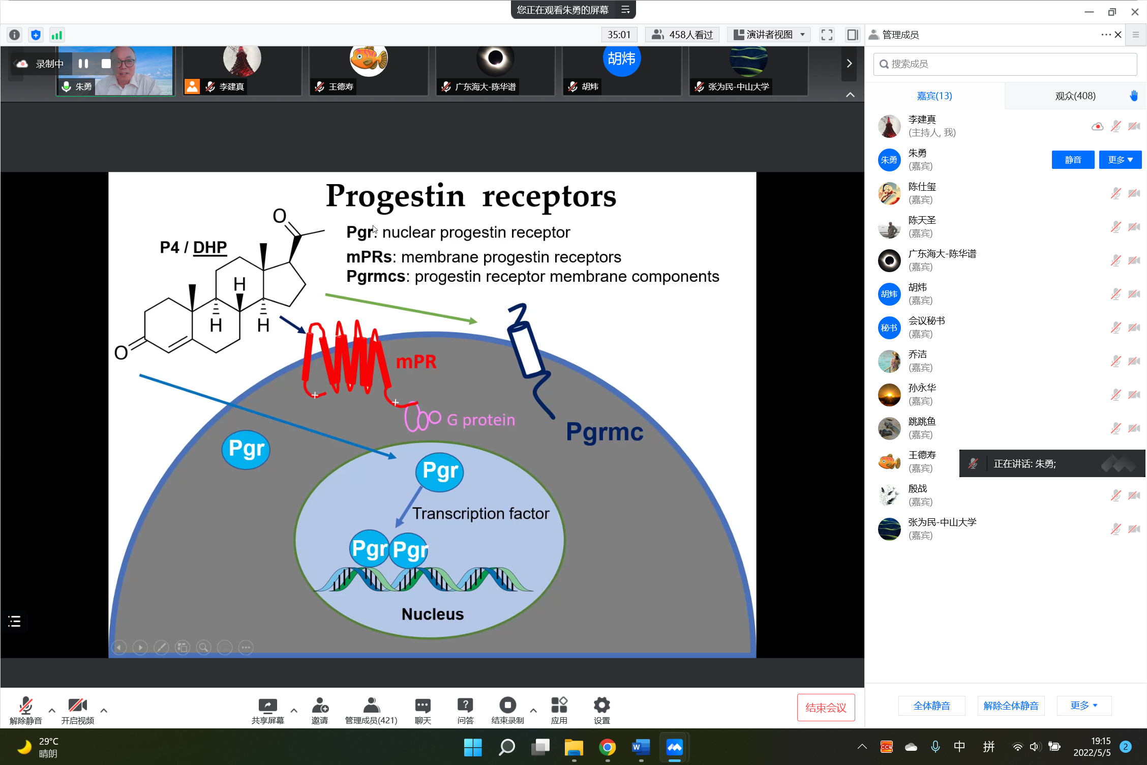 5月5日晚,应公司邀请,美国东卡罗来纳大学朱勇教授为公司师生作了题为“鱼类性腺发育的调控”的线上报告。此次线上报告由公司和厦门大学、集美大学、广东海洋大学的相关公司联合举办。报告由副经理李建真教授主持,近500名师生参加了此次报告,来自美国奥本大学、澳门大学、中国科公司水生生物研究所、西南大学、中山大学、上海交通大学等研究所和高校的多位知名专家也参加了报告会。朱教授介绍了近期其实验室在孕酮的功能和机制中取得的新进展,详细介绍了最近利用斑马鱼为模型发现的孕酮核受体调控鱼类排卵的新机制。与会师生就相关科学问题与朱教授进行了讨论交流。报告的最后,由中国科公司水生生物研究所所长殷战研究员作了总结陈词。