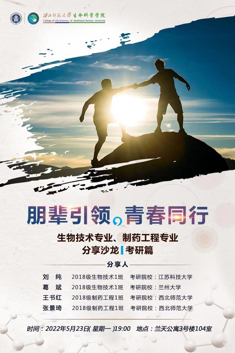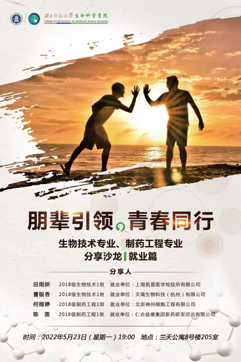 5月22日,23晚,公司举办了“朋辈引领,青春同行”优秀毕业生分享沙龙系列活动之生物技术与制药工程专业普通计划推免、考研、就业篇,本次活动分别在兰天公寓8号楼205、3号楼104党员活动室举行,公司2022届推免,保研,就业共11位同学给来自2019级,2020级相关专业60余位同学讲述自身经历,交流切身体会,分享自己保研、考研以及找工作的经验,此次分享会分别由团委专职辅导员张金慧、刘博和陈玉涛主持。