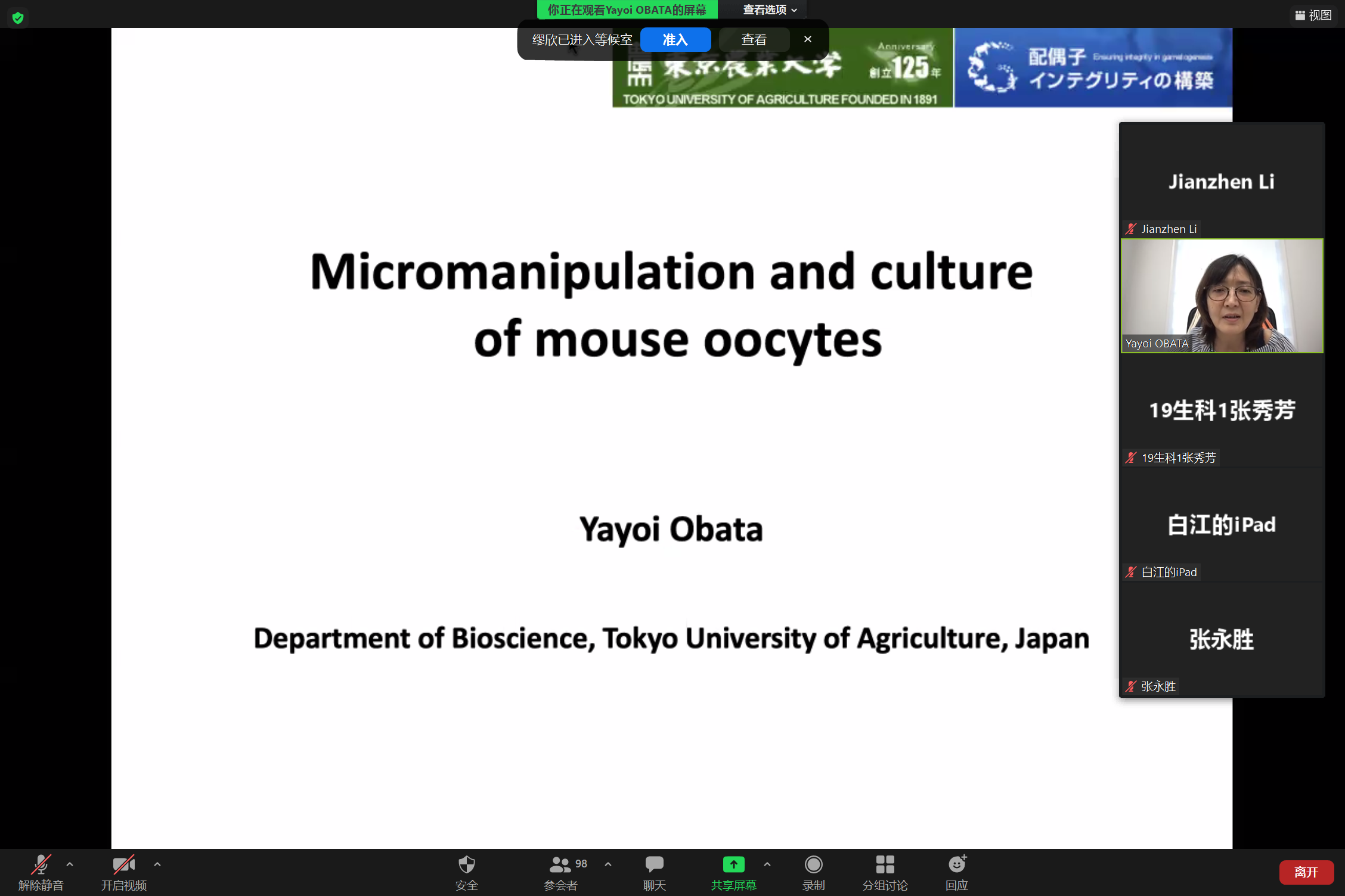 6月11日上午,应公司邀请,国际知名发育生物学家、日本东京农业老员工物科学系Yayoi Obata教授为公司师生作了题为“Micromanipulation and culture of mouse oocytes”的线上报告。Obata教授介绍了其在细胞核移植和卵子体外培养等研究中取得的发现和新进展。报告由副经理李建真教授主持,130余名师生参加了此次报告,来自美国斯坦福大学、山东大学、内蒙古大学、兰州大学等高校的多位专家和员工也参加了报告会。与会师生就相关科学问题与Obata教授进行了讨论交流。