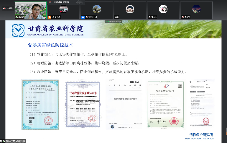 报告伊始,漆永红博士从总体上介绍了我国中药材的质量管控体系、种植模式、核心技术要点以及甘肃省中药材的种植情况。随后详细介绍了其研究团队在当归、黄芪、党参、黄芩等四种中药材相关病虫害绿色生物防控领域的研究成果,同时也分享了在百合病害生防微生物菌剂研发方面的进展。最后,漆老师总结了中药材研究工作中存在的问题,提出了一些解决办法,并对中药材病虫害绿色防控研究前景做了展望。与会师生还就相关中草药病虫害绿色防控方面的其他科学和技术问题与漆老师进行了进一步的交流和探讨。