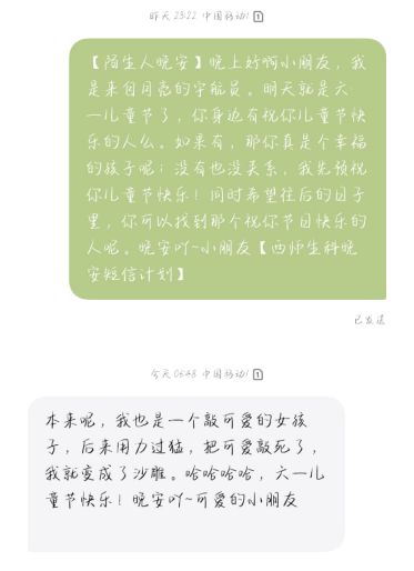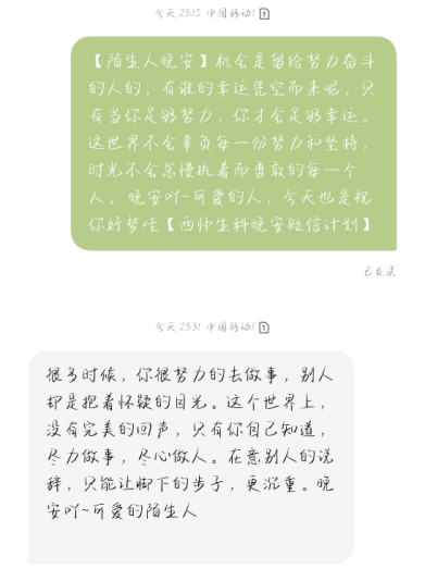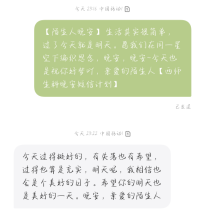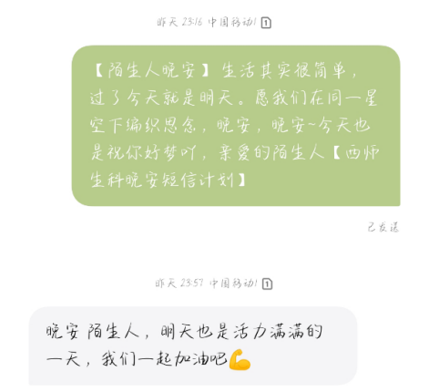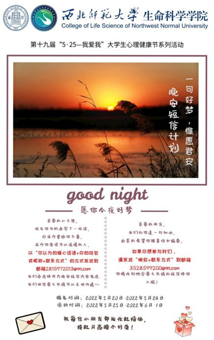 暖心的问候带来力量,美好的睡眠治愈焦虑。公司晚安短信计划旨在关照每一位需要关怀的生科学子,在迢迢月光与漫天星光中,给大家送去安心与希冀。通过开展此次活动,不仅加强了老员工的心理健康教育,而且让同学们都感受到了爱与温暖,让每一个夜晚都变得与众不同。