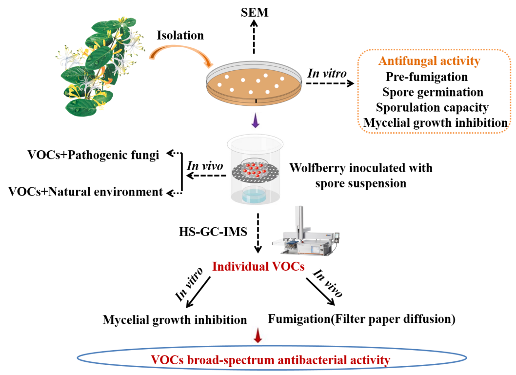课题组从金银忍冬(Lonicera maackii (Rupr.) Maxim)中分离到了1株具有广谱抗菌作用的植物内生菌Bacillus velezensis L1,研究发现,B. velezensi L1及其VOCs可有效防治由病原真菌A. iridiaustralis引起的枸杞果实腐烂病,从而延长贮藏时间。生防机制研究揭示:VOCs可通过破坏致病菌微观结构从而显著抑制的菌丝生长、降低产孢量并抑制孢子的萌发。体内实验表明,VOCs生防功能在一定的范围内与其浓度呈正相关,随着浓度的增加,生防效果逐渐加强,当浓度达到某一阈值后,病原真菌对枸杞果实的影响基本完全消除。研究将为果蔬采后病害防治提供生防资源和相应的理论依据。
