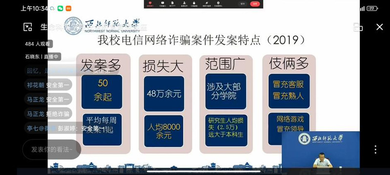 讲座上,石晓东明确指出安全的定义,并进一步对同学们在校园生活中经常出现的安全问题提出防范要求,通过列举高校真实案例,从人身安全、财产安全、消防安全、交通安全、防范网络电信诈骗等方面为同学们讲授大学安全保障知识。石晓东重点讲述了近年来发生在公司的网络电信诈骗案例,强调同学们要在网络生活中提高警惕,不要贪图小利、因小失大,他呼吁同学们下载注册国家反诈中心、金钟罩等有关防诈软件,进一步提高防范意识。