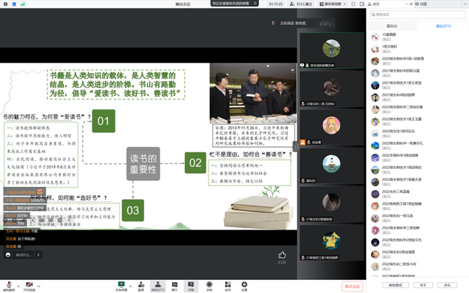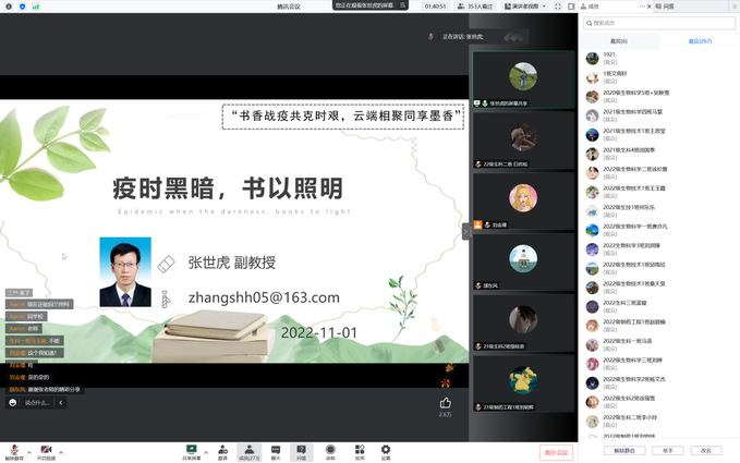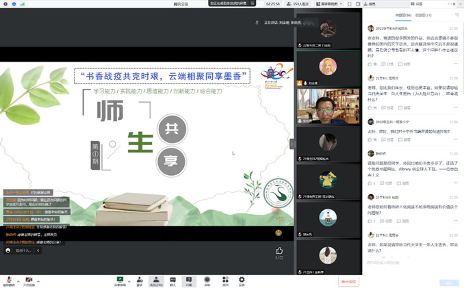 书香致远,读立芳华。为帮助同学们培养良好的阅读习惯,提高自身审美修养,11月1日晚,金沙城js93线路检测中心线上举办书香战疫读书分享会。此次会议特邀张世虎副教授做分享,辅导员颉东风及金沙城js93线路检测中心全体员工参加此次会议。